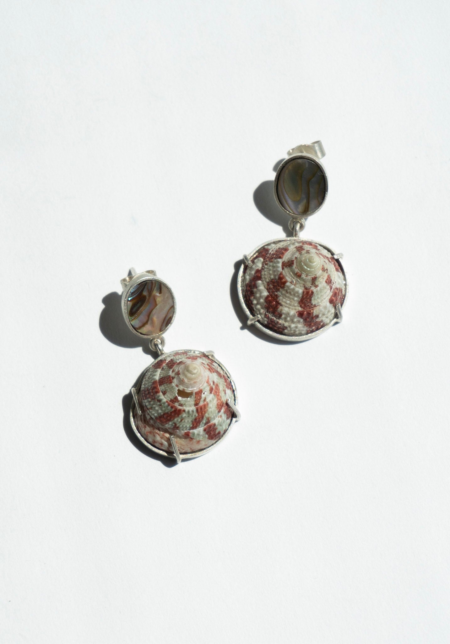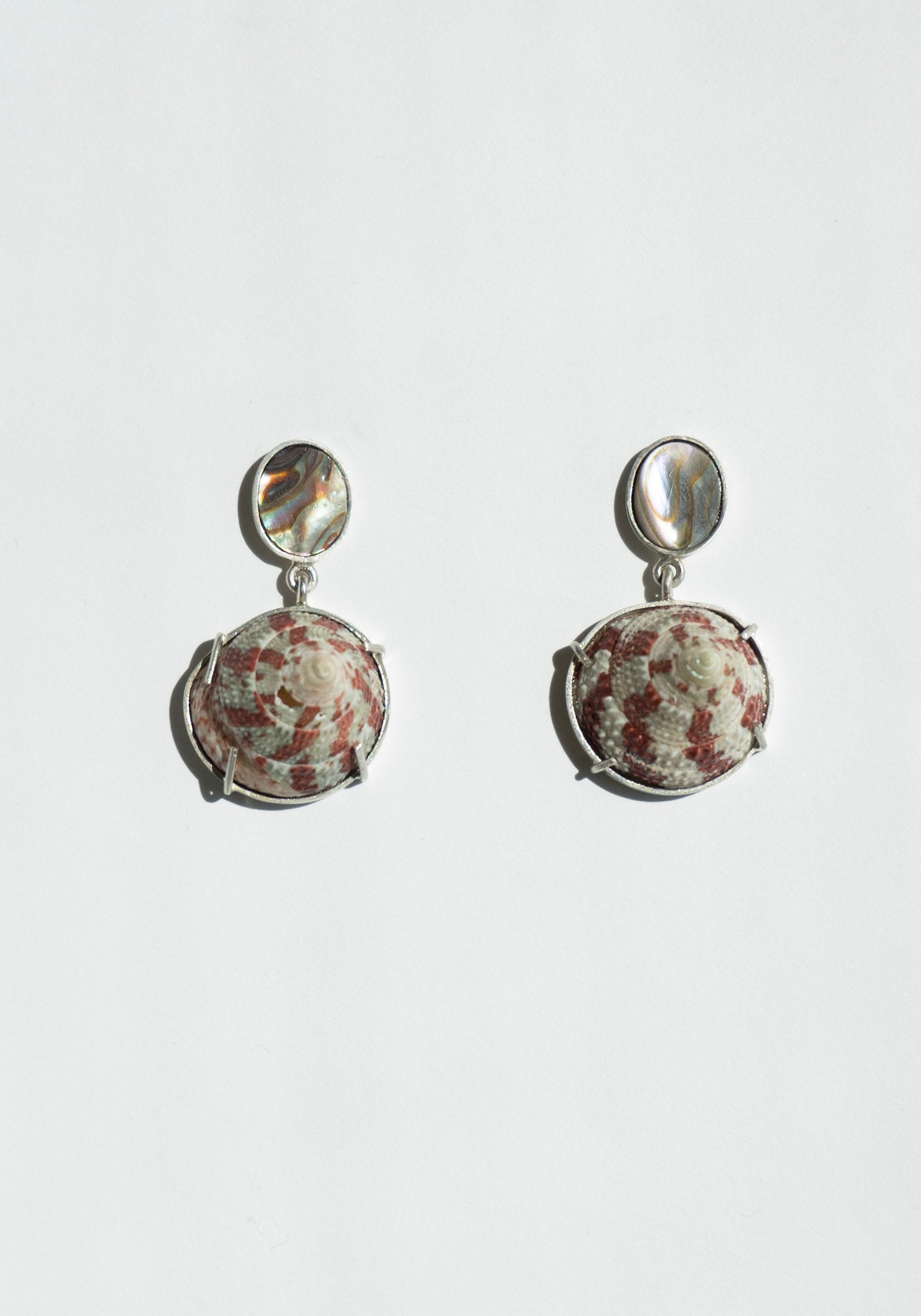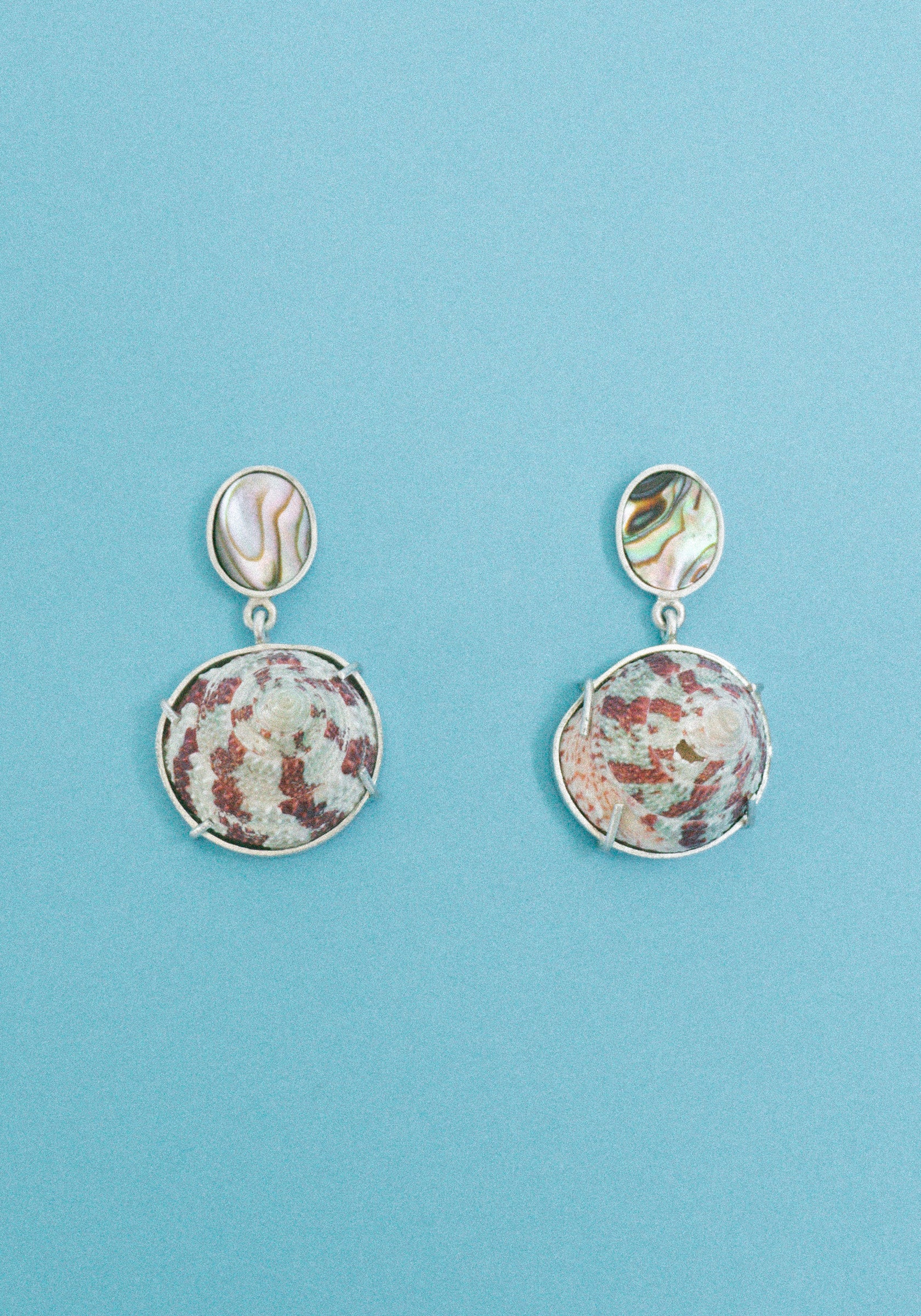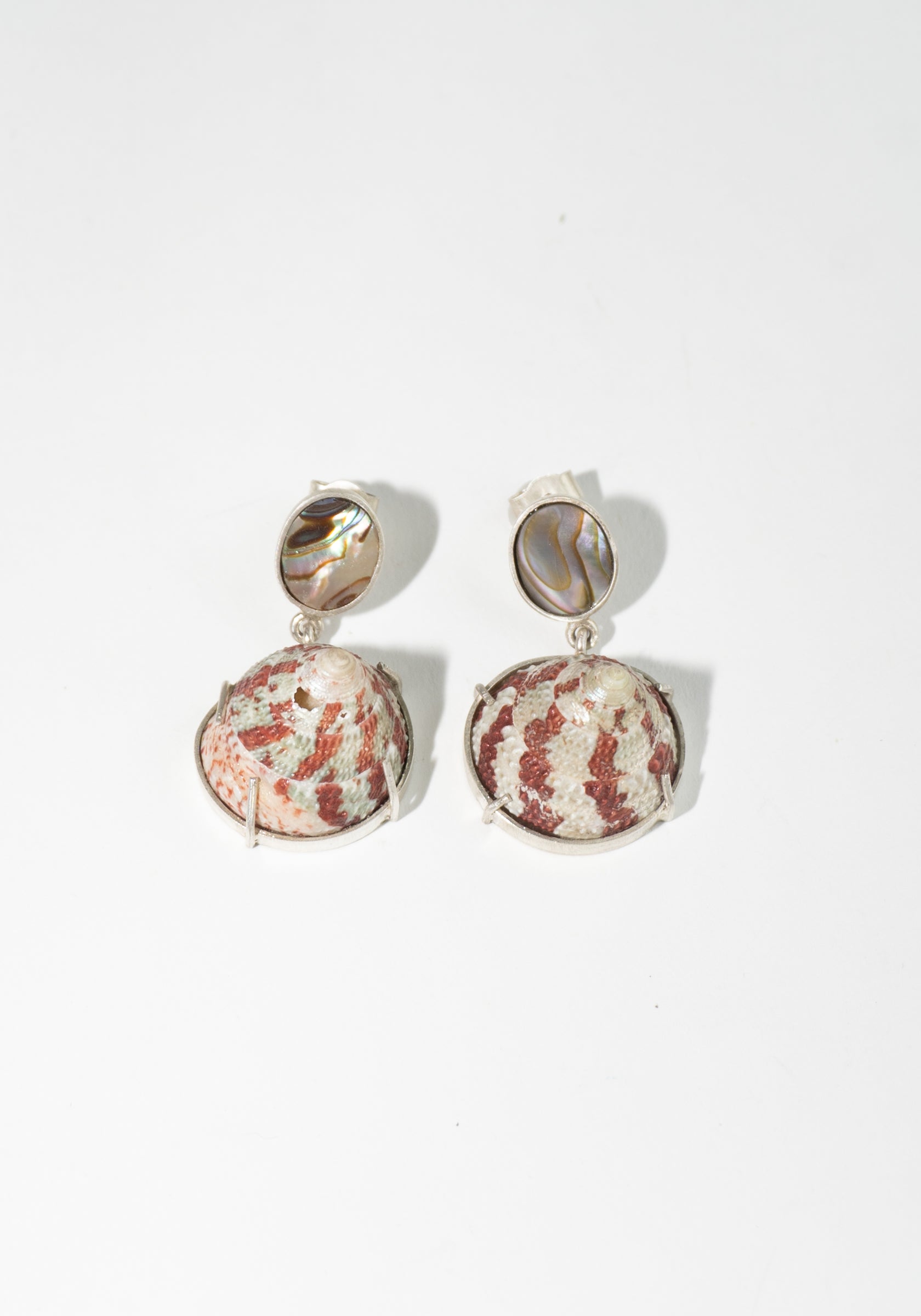 No. 011 Shell Earrings in Silver from La Ma R. These earrings feature natural cone shells set in sterling silver frame, with an abalone stud.