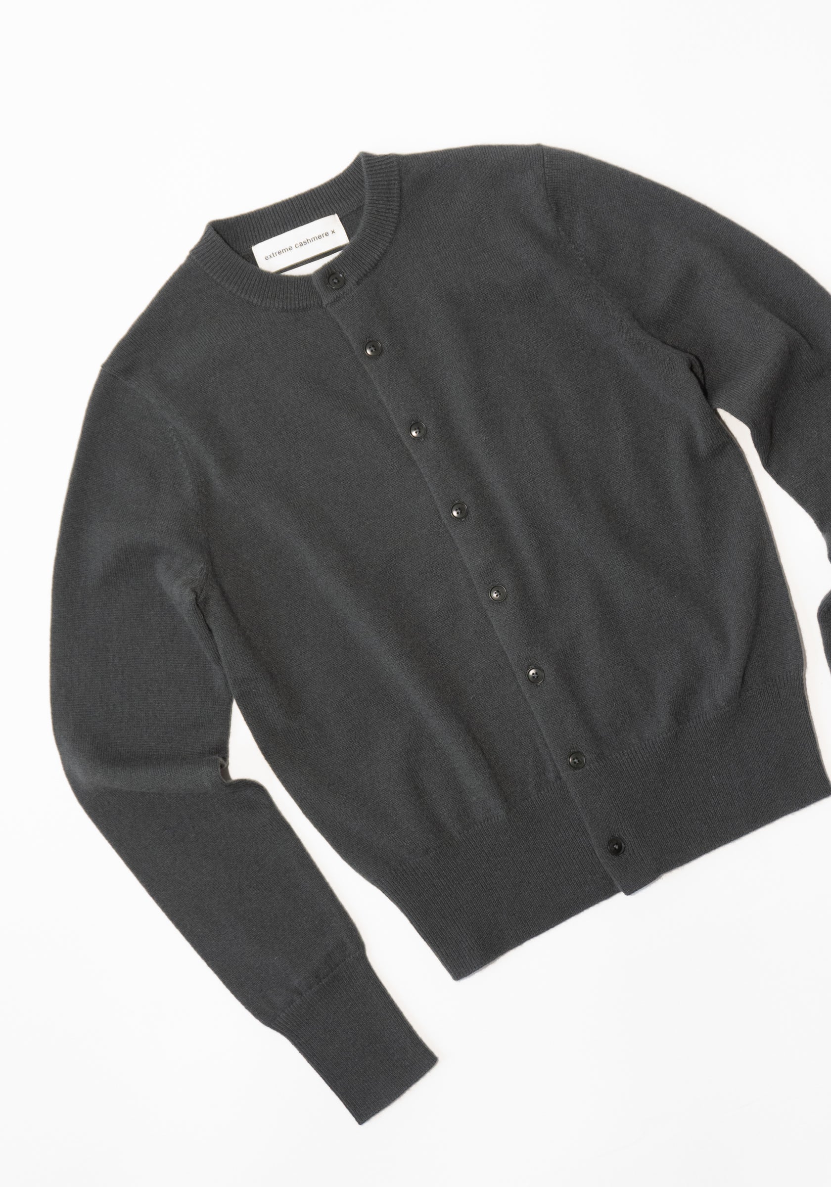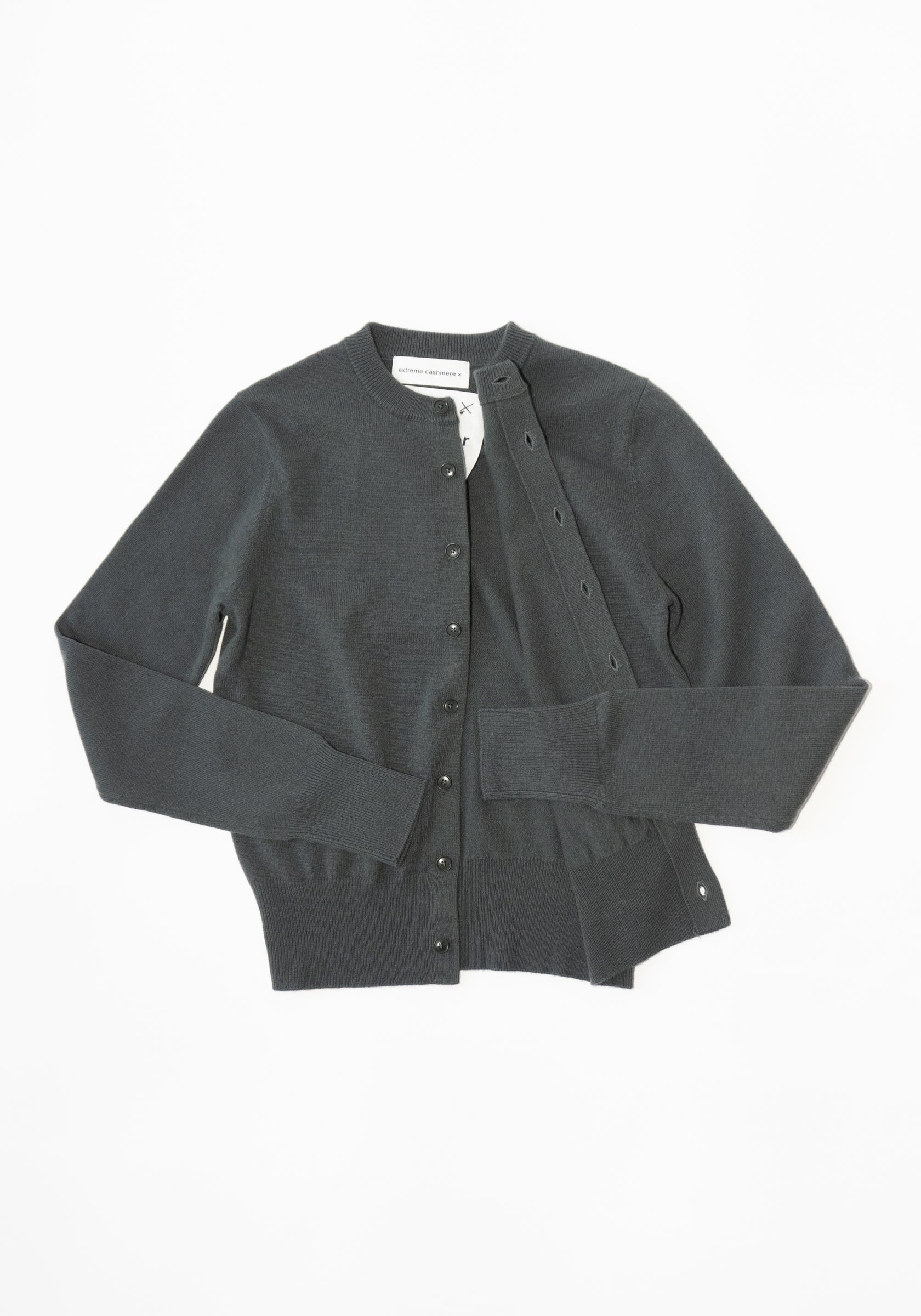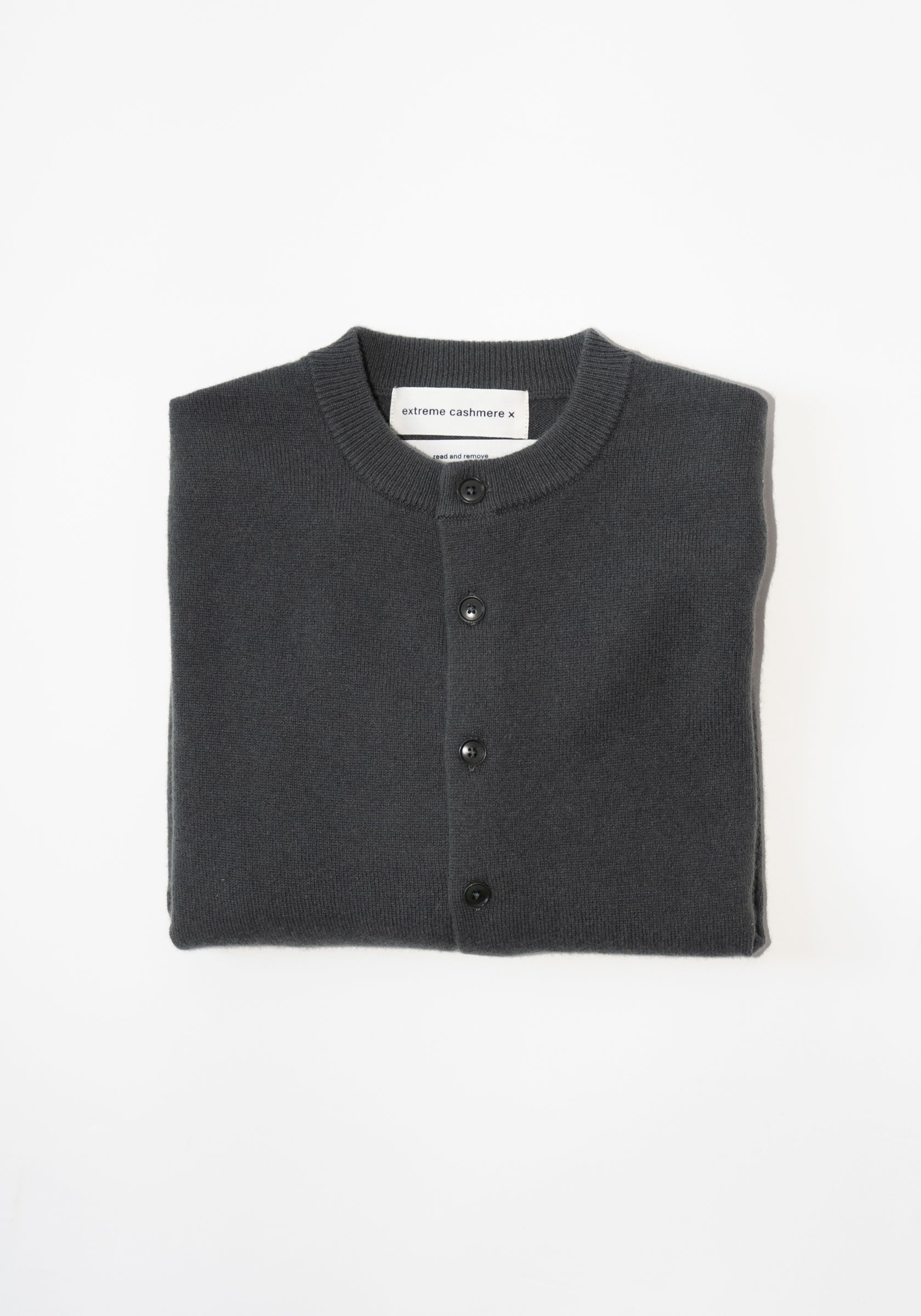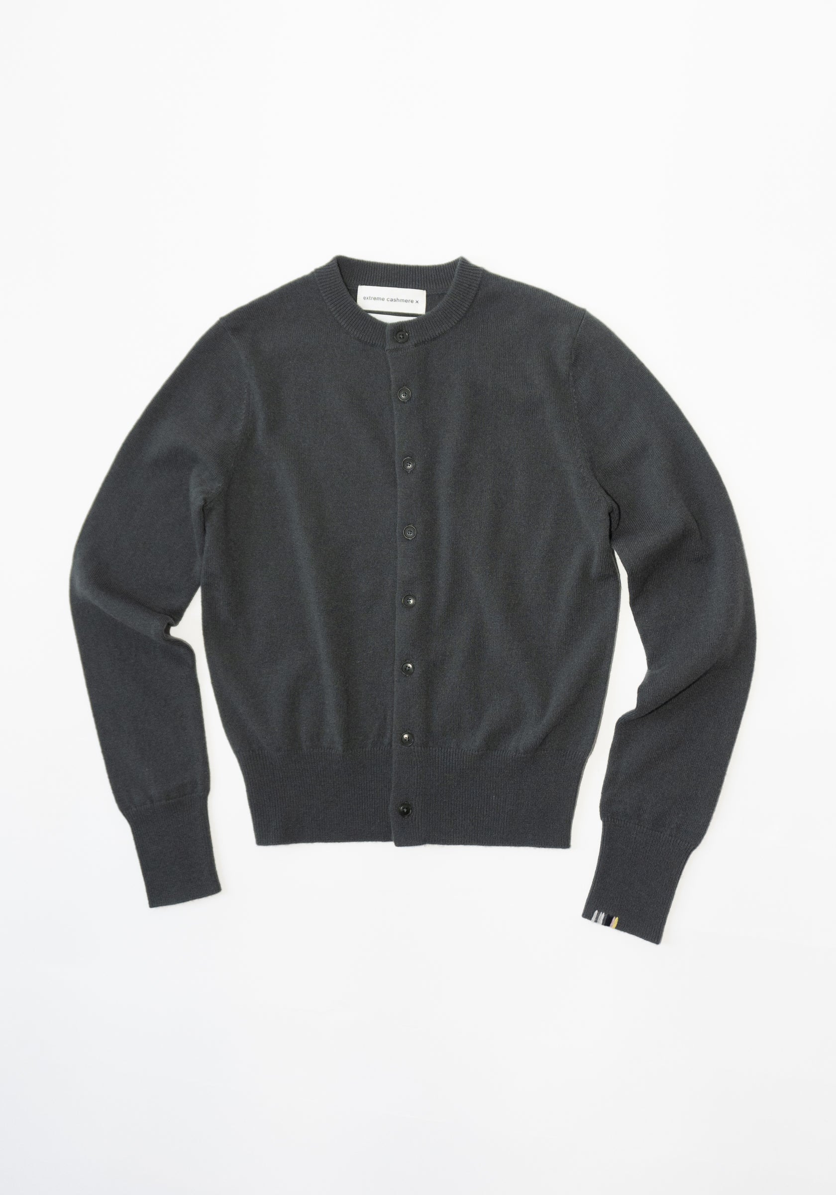 Little 2 in Lake from Extreme Cashmere. Classic cashmere crew-neck cardigan with eight buttons and a petite fit. The buttons are made of highly durable corozo, a completely natural, chemical-free material derived from the seed of a palm tree.