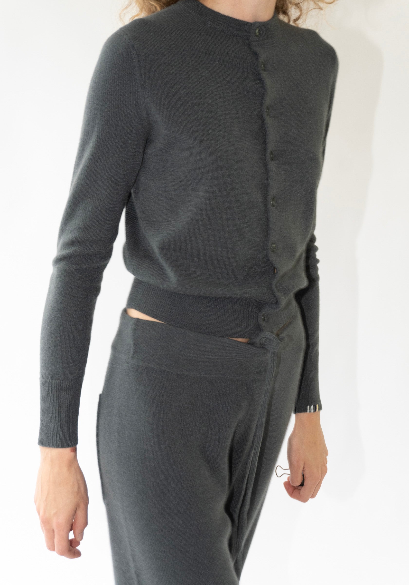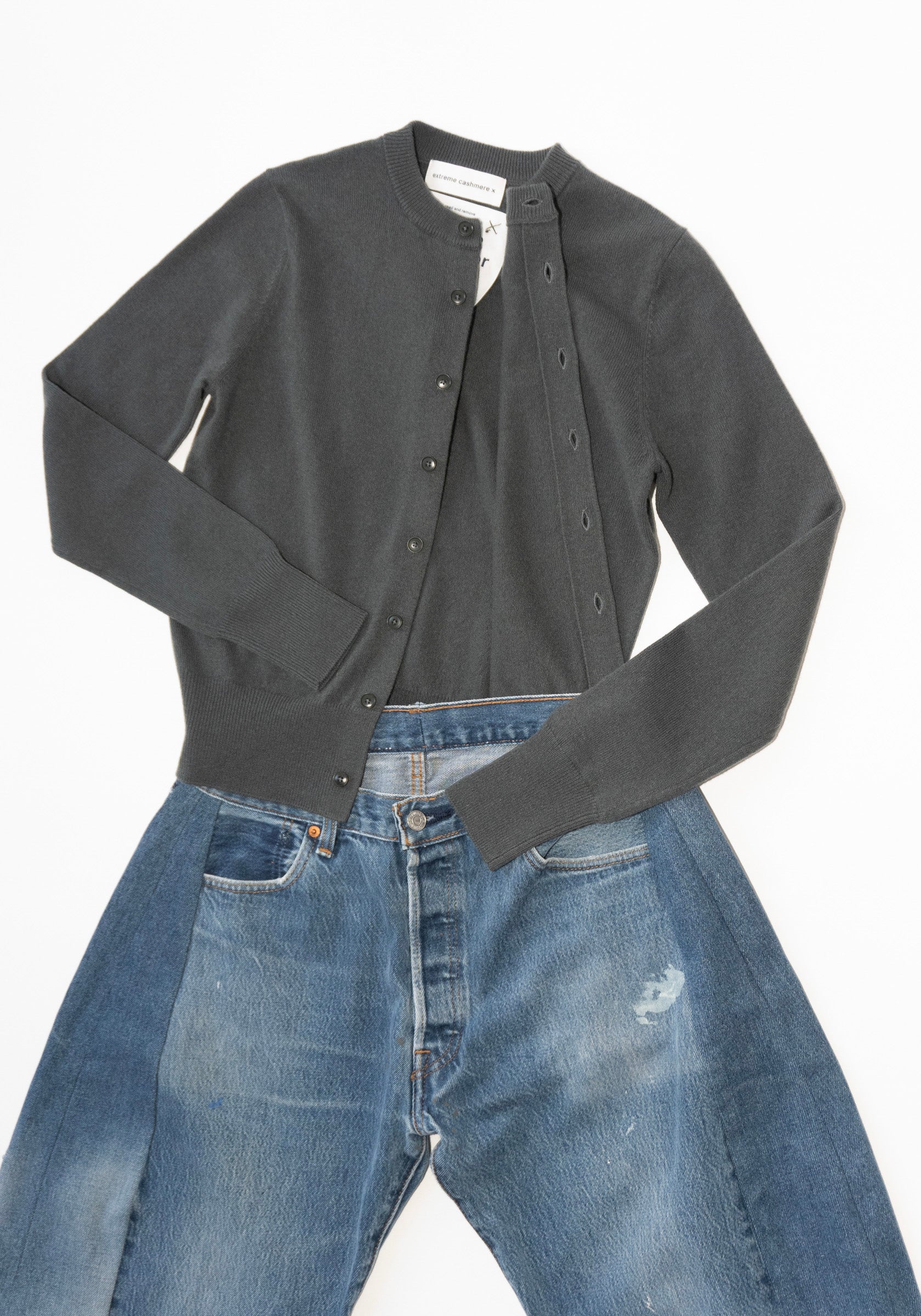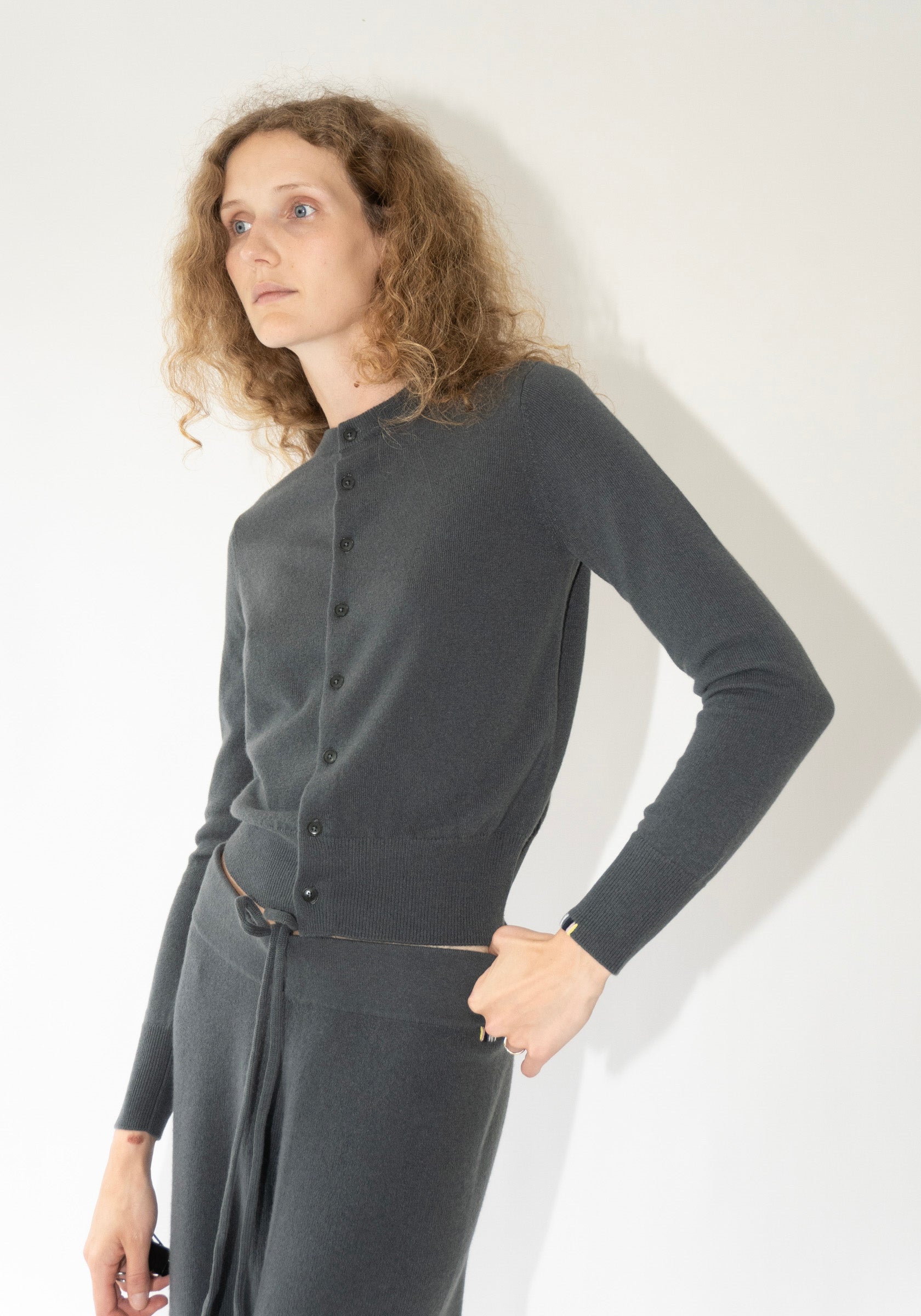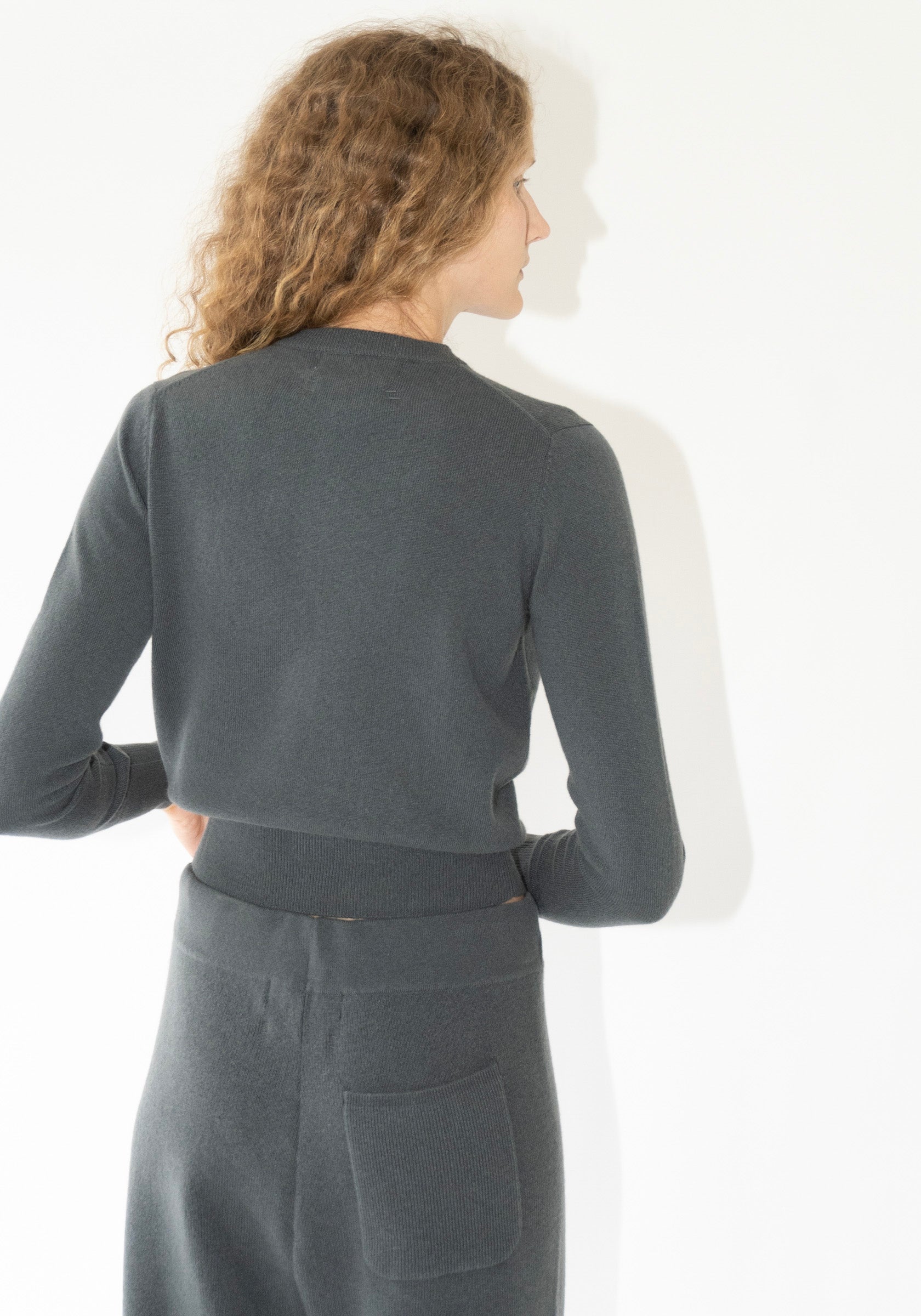 Little 2 in Lake from Extreme Cashmere. Classic cashmere crew-neck cardigan with eight buttons and a petite fit. The buttons are made of highly durable corozo, a completely natural, chemical-free material derived from the seed of a palm tree.