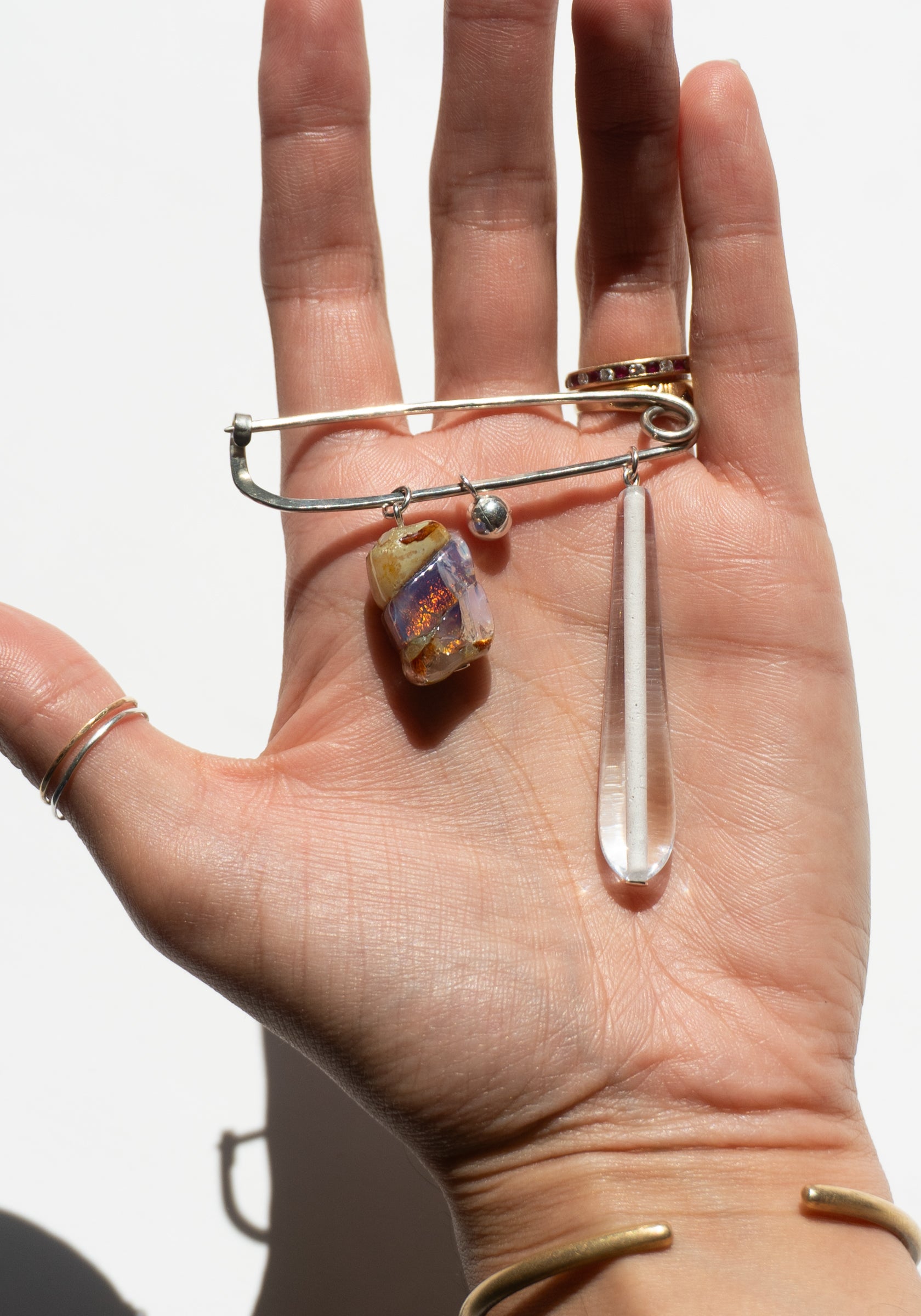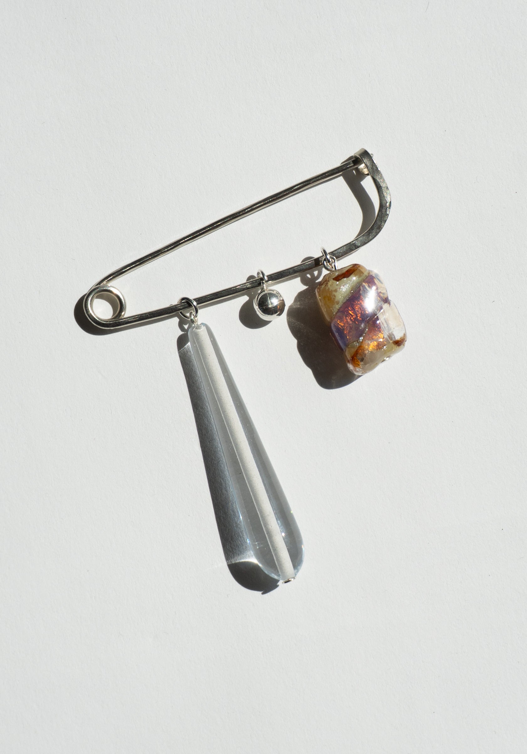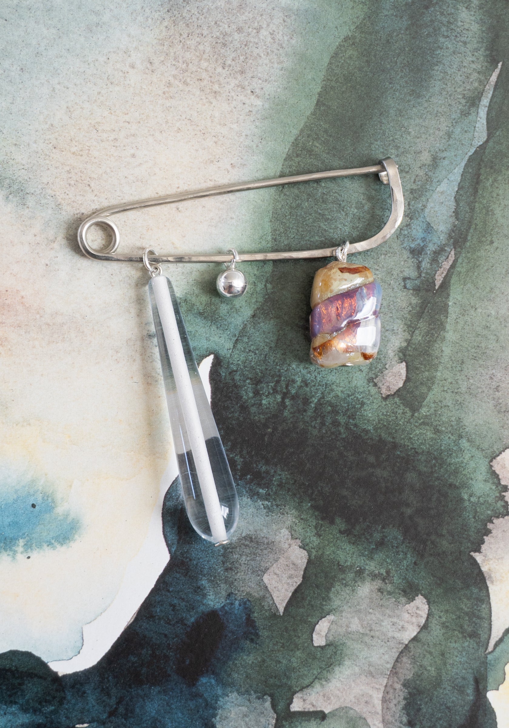 Multicolor Pull Brooch from Sisi Joia. Sterling silver hammered pin with two unique glass beads and a silver ball pendant. Handmade in Paris.