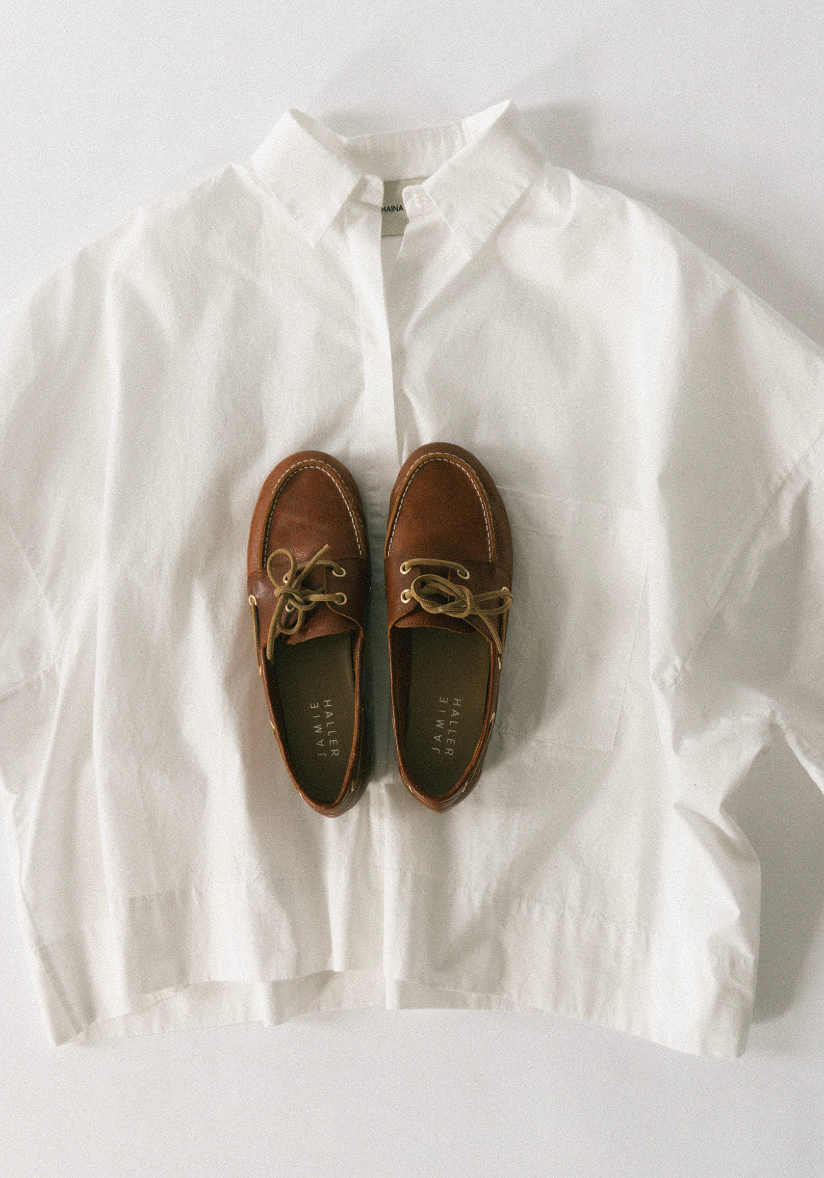 Boat Loafer in Brown from Jamie Haller. Inspired by classic nautical shoe styling and combined with their signature penny loafer fit and feel. Handmade in Italian Unlined Buffalo, hand-waxed for a depth of color and sheen that gets better with wear. Handmade in Tuscany, in an old world family style factory.