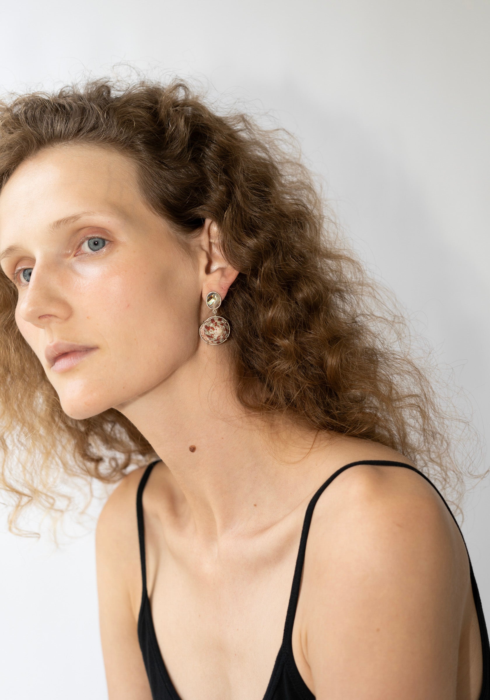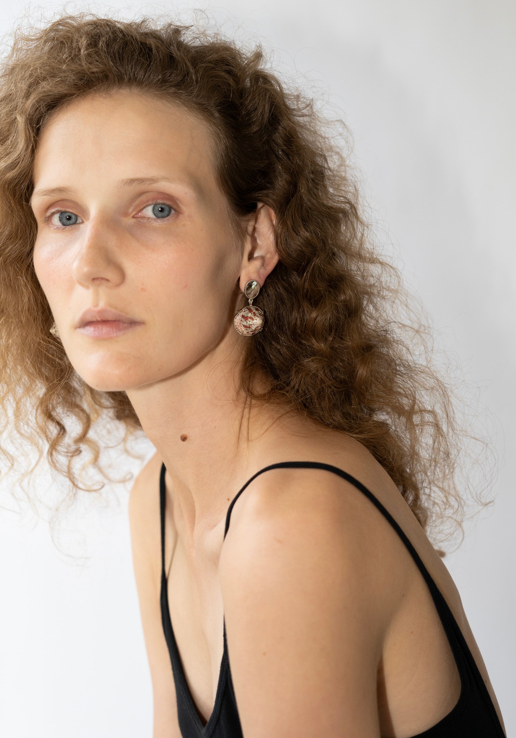 No. 011 Shell Earrings in Silver from La Ma R. These earrings feature natural cone shells set in sterling silver frame, with an abalone stud.