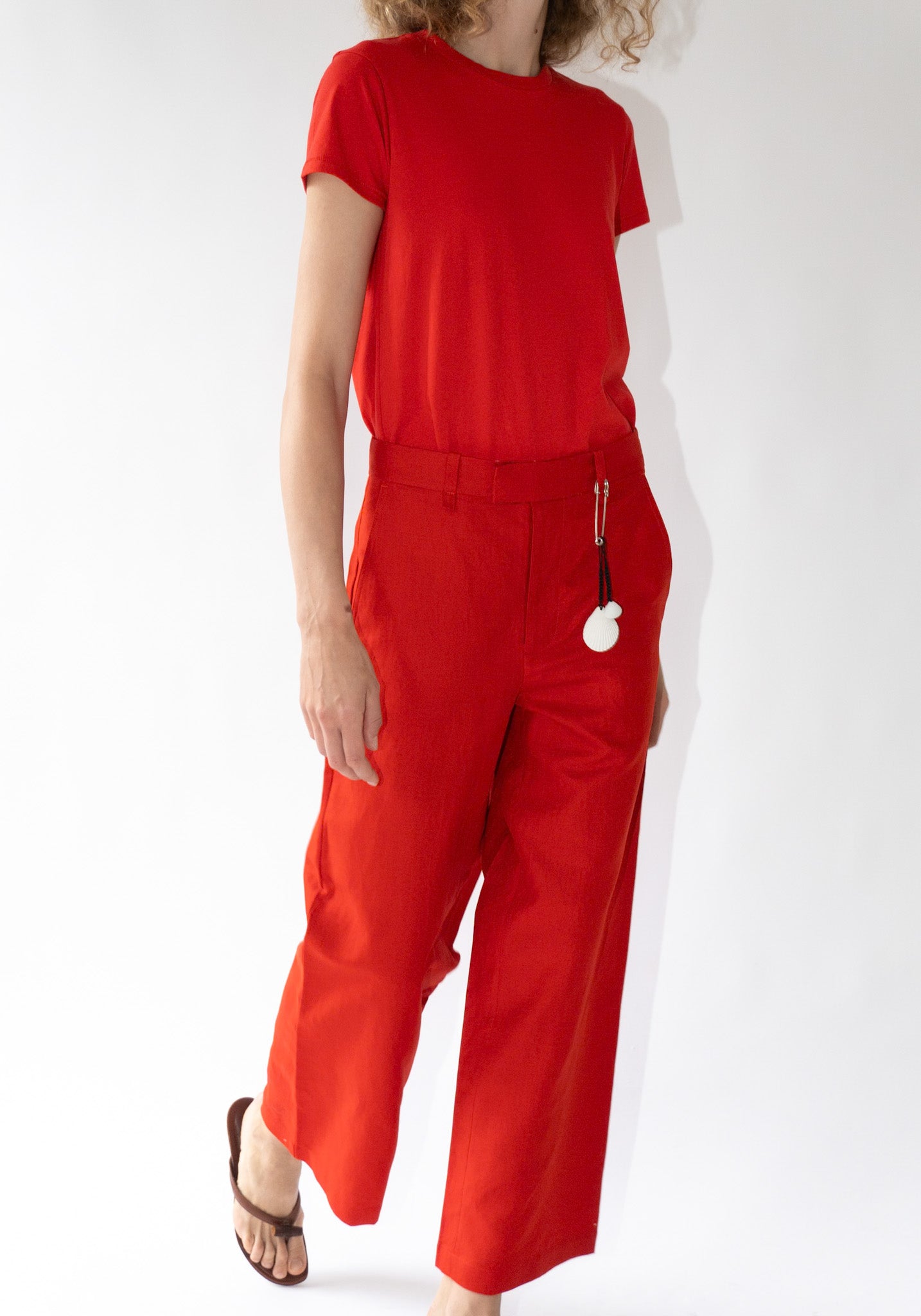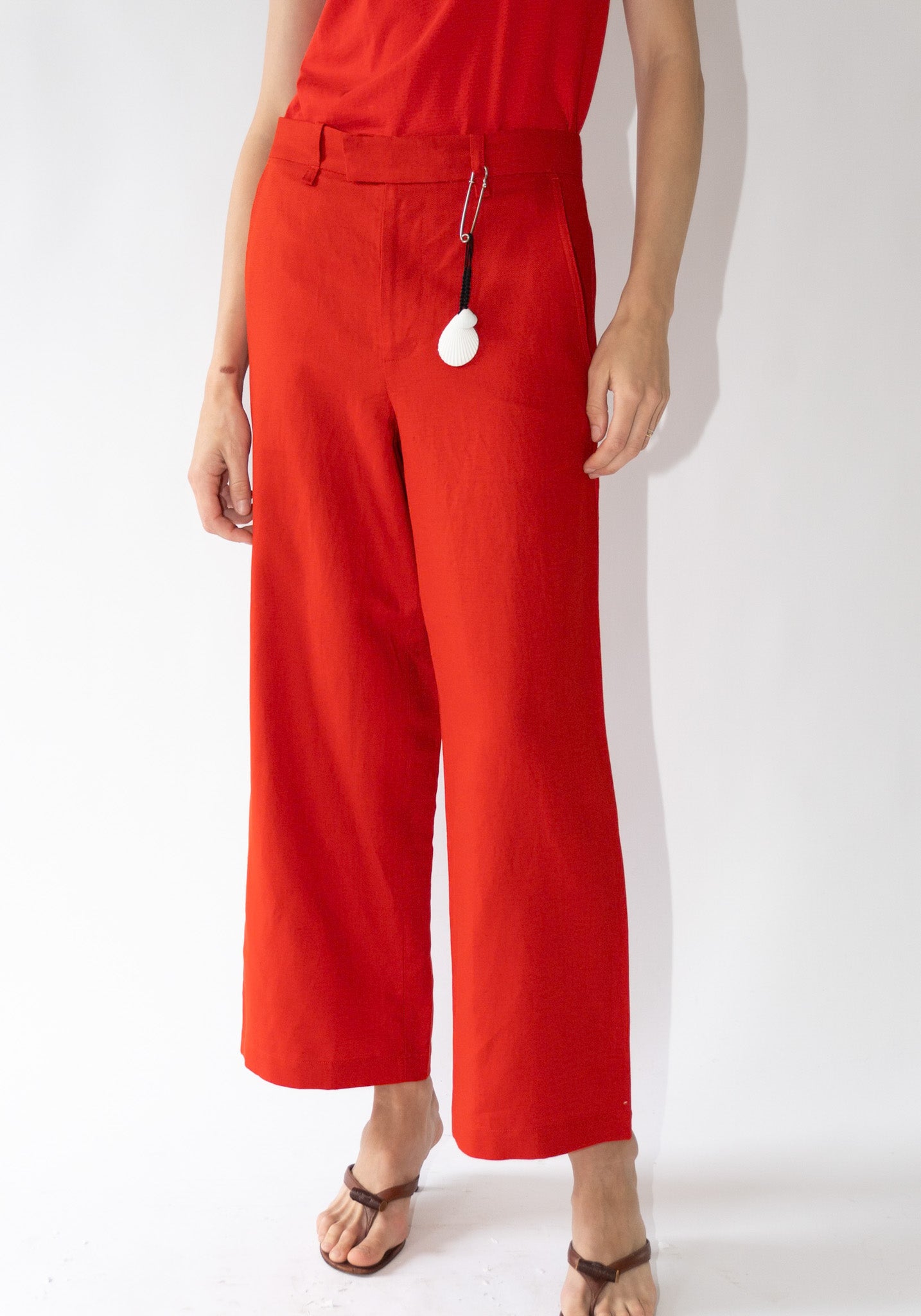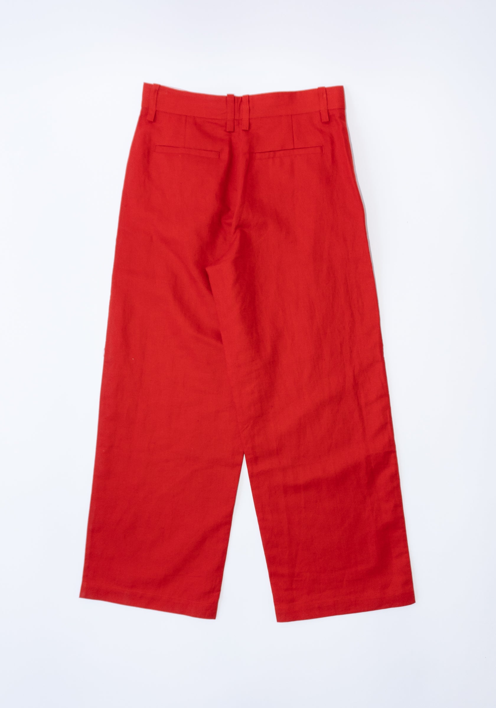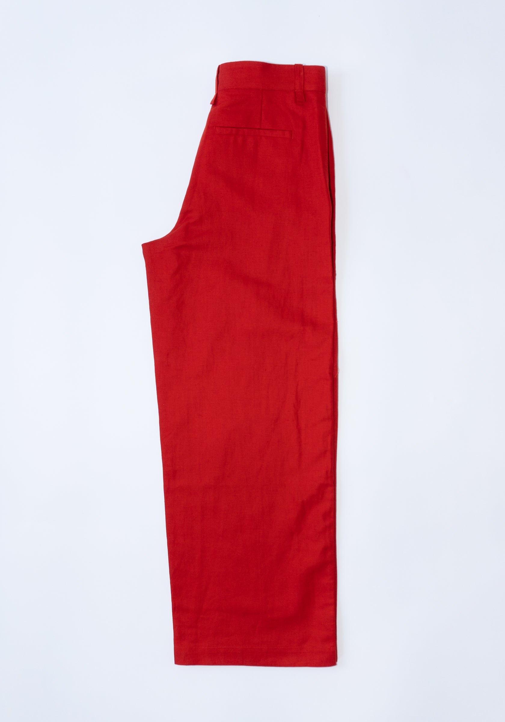 Cropped Roomy Trouser in Pimento from 6397. A wide relaxed leg pant that tapers slightly to the bottom opening. Made to sit on the high hip, featuring has side slit pockets and a single welted pocket on the back.