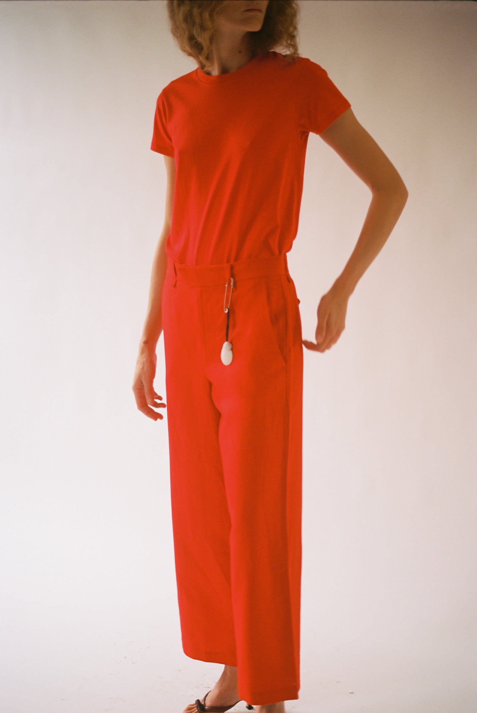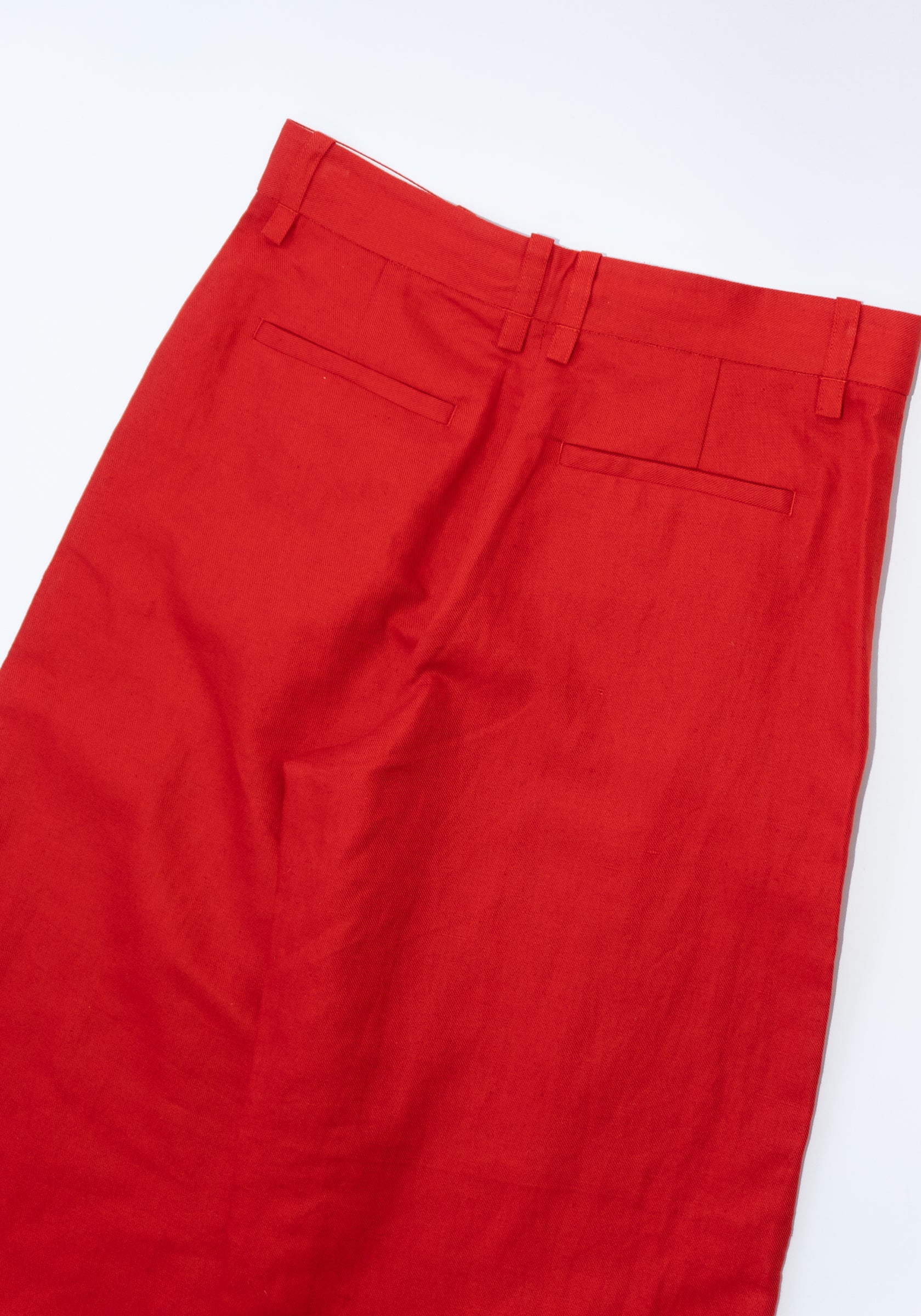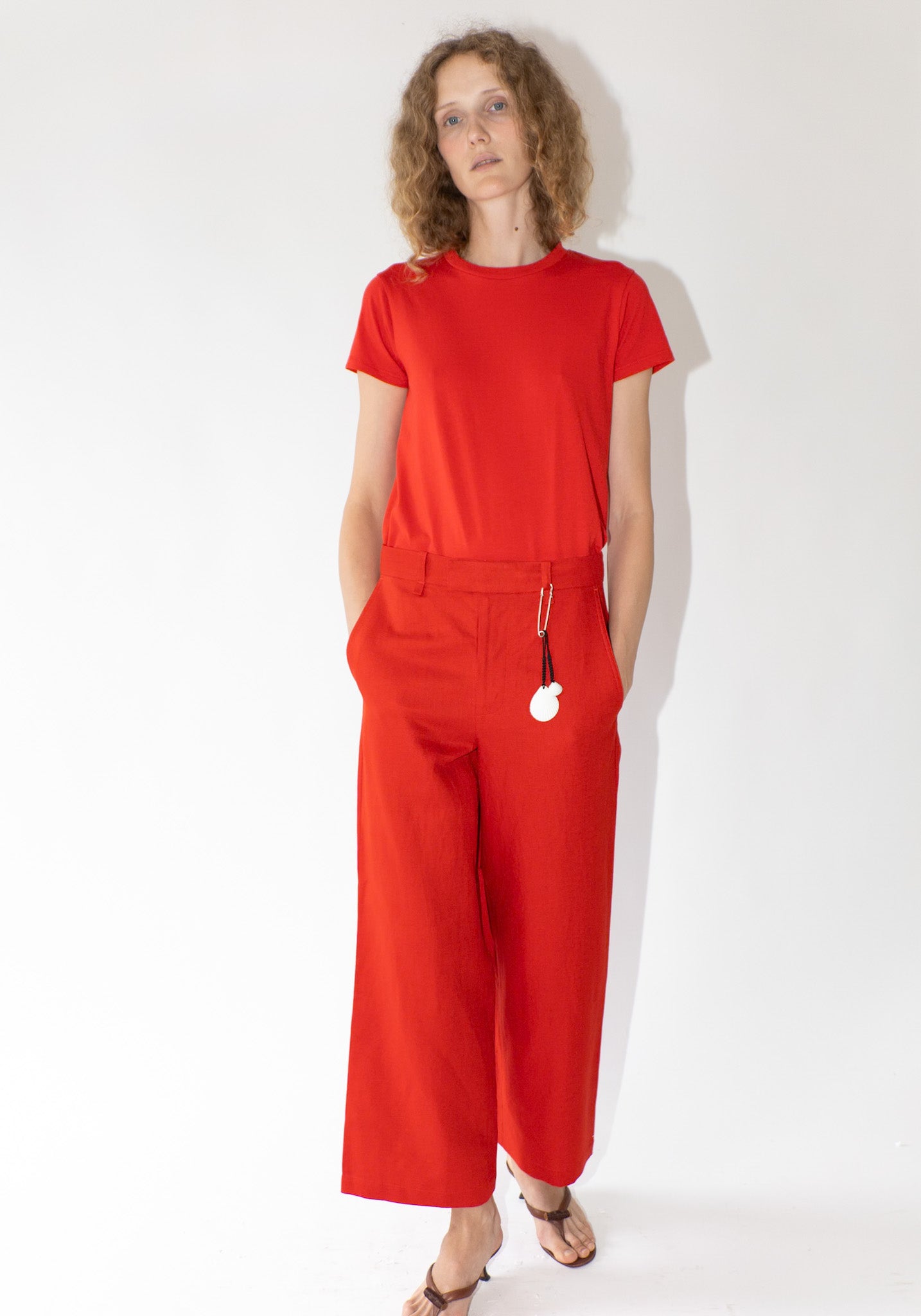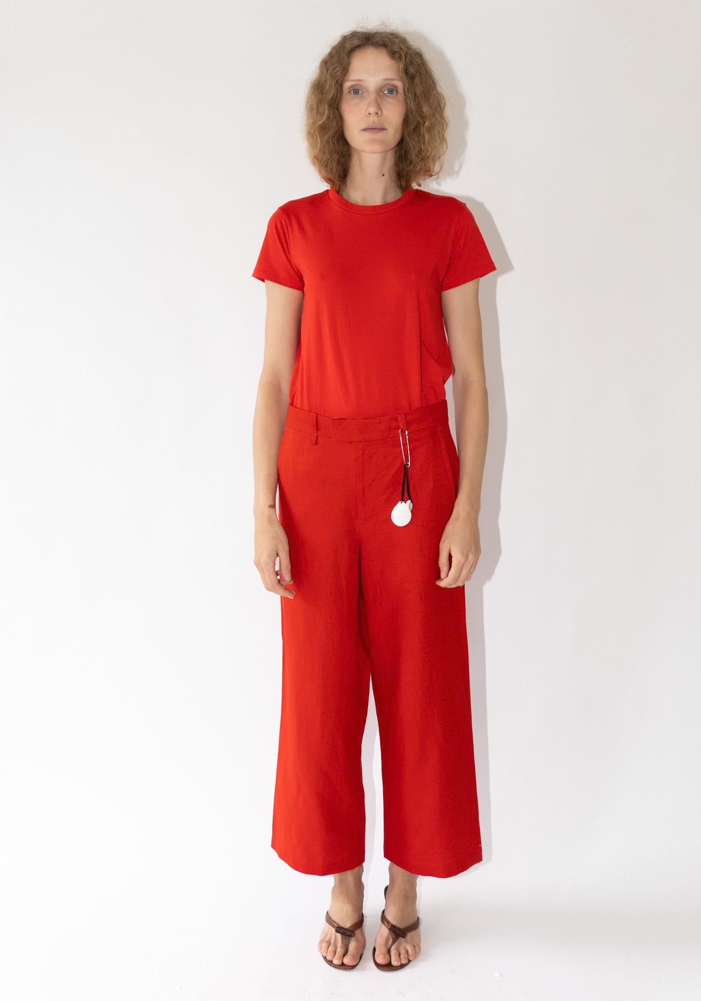 Cropped Roomy Trouser in Pimento from 6397. A wide relaxed leg pant that tapers slightly to the bottom opening. Made to sit on the high hip, featuring has side slit pockets and a single welted pocket on the back.