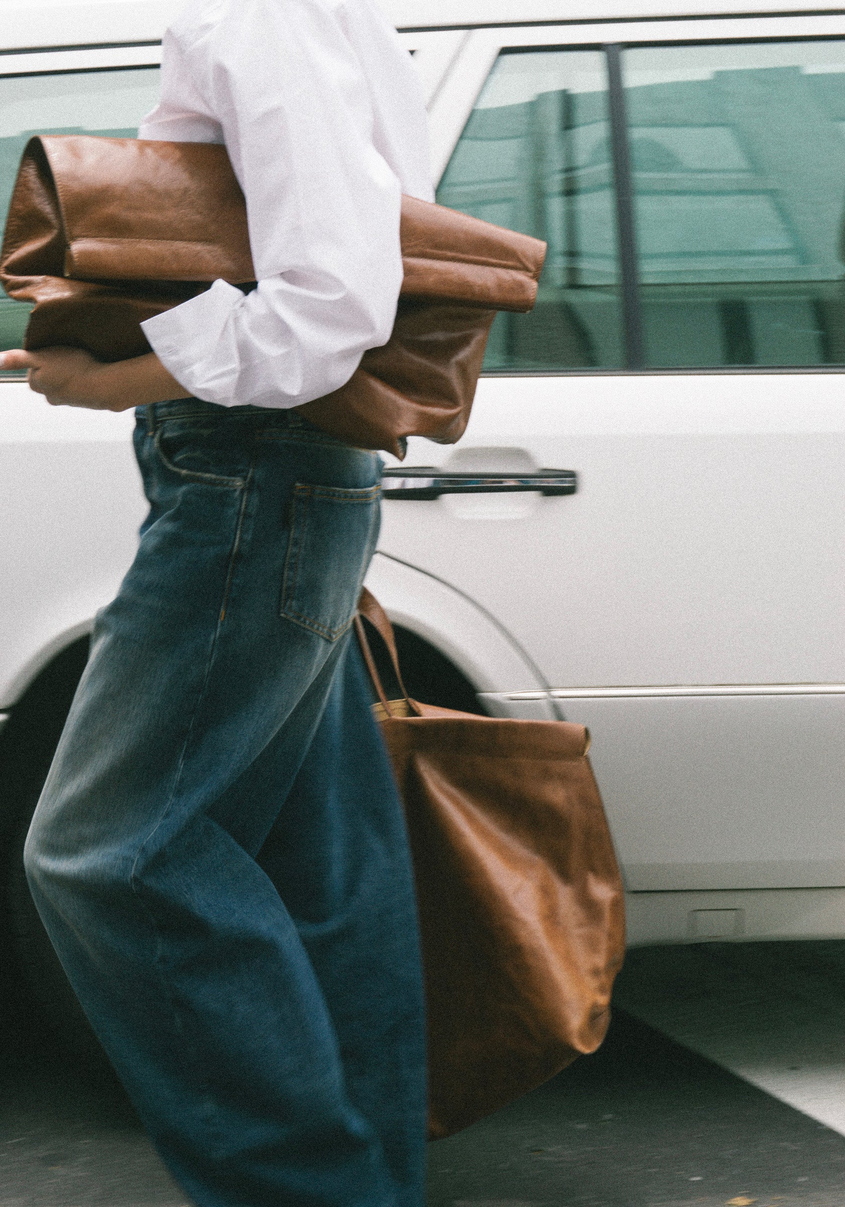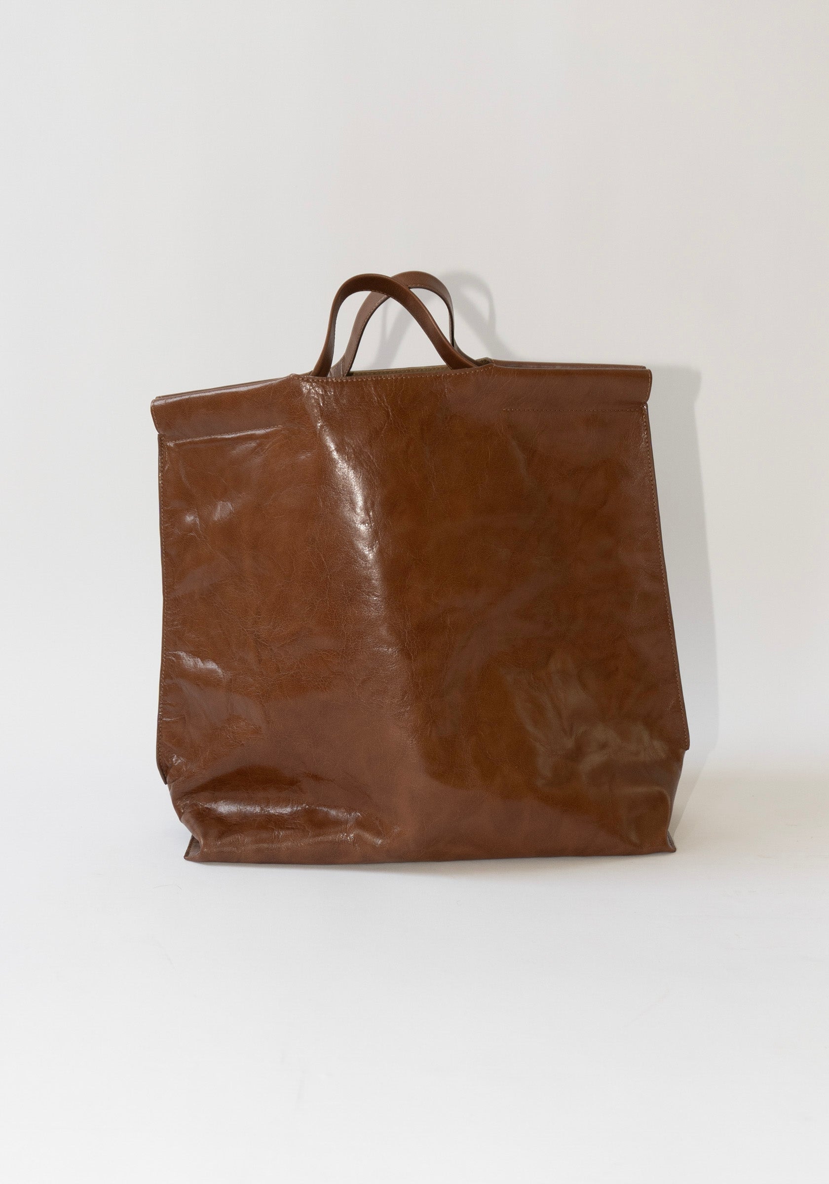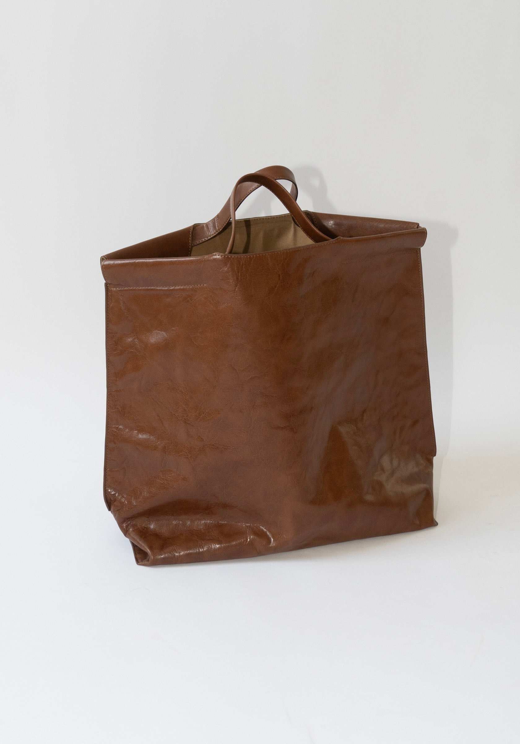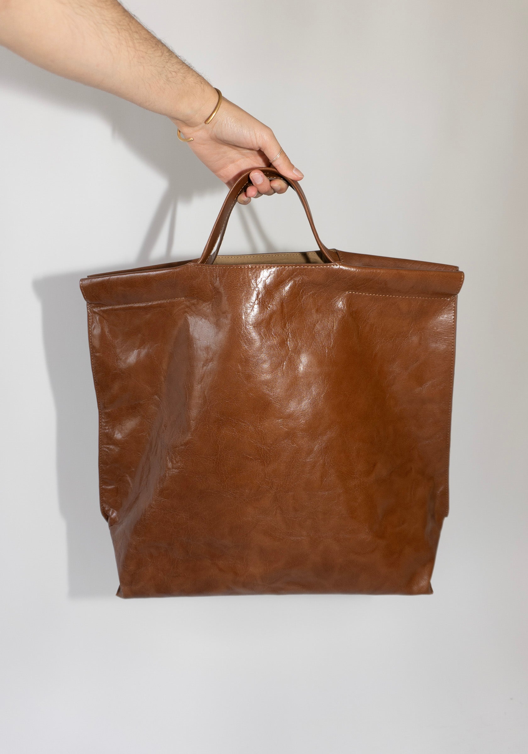 Large Shopper Bag Cognac from Bea Mombaers. Tumbled leather bag with detachable interior pouch and short top handles in nappa leather. Features an interior zipper pocket, a detachable clasp key ring and two interior slip pockets. Top handles can convert into a single shoulder strap which creates a ruching effect. Lined in cotton canvas.