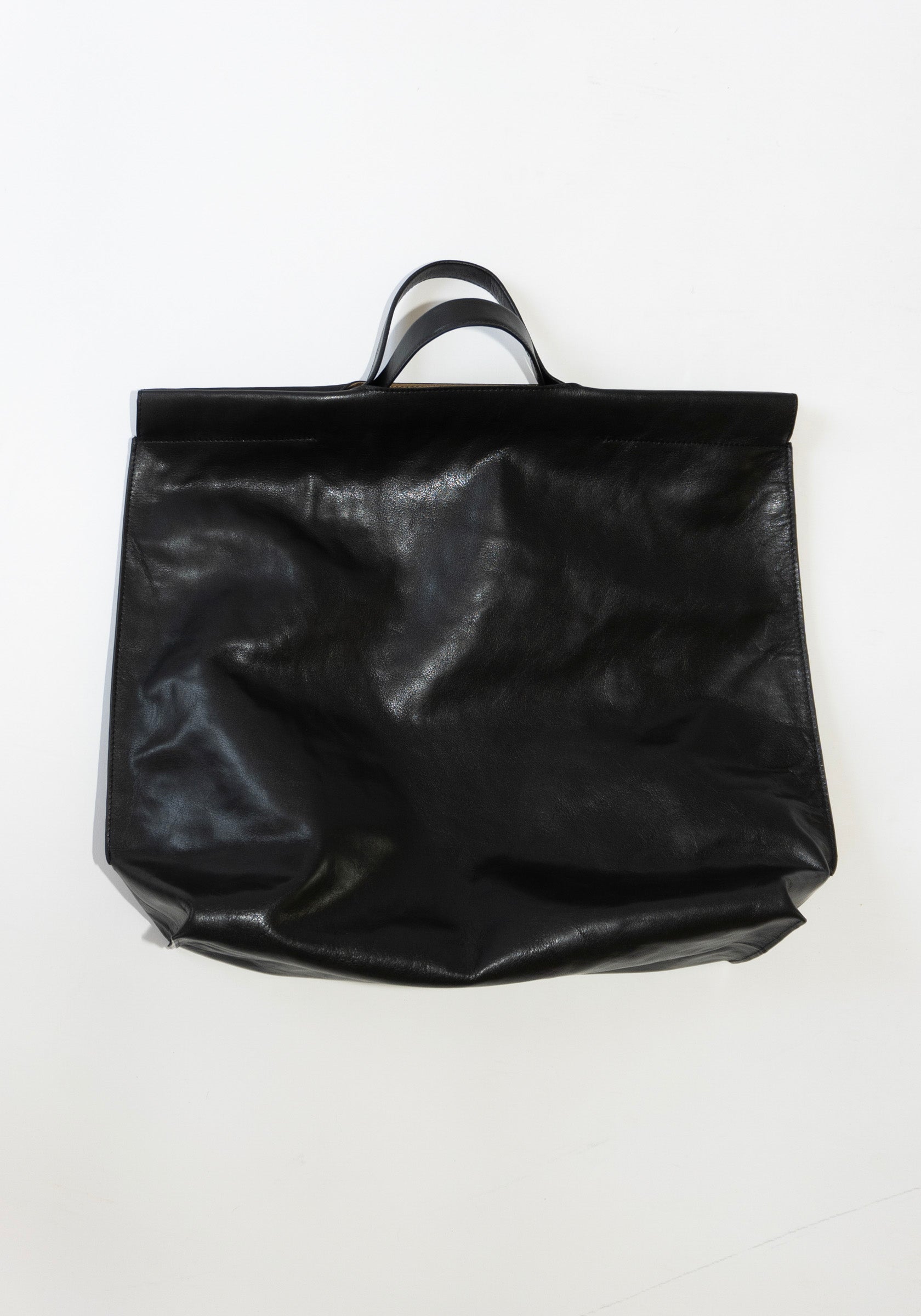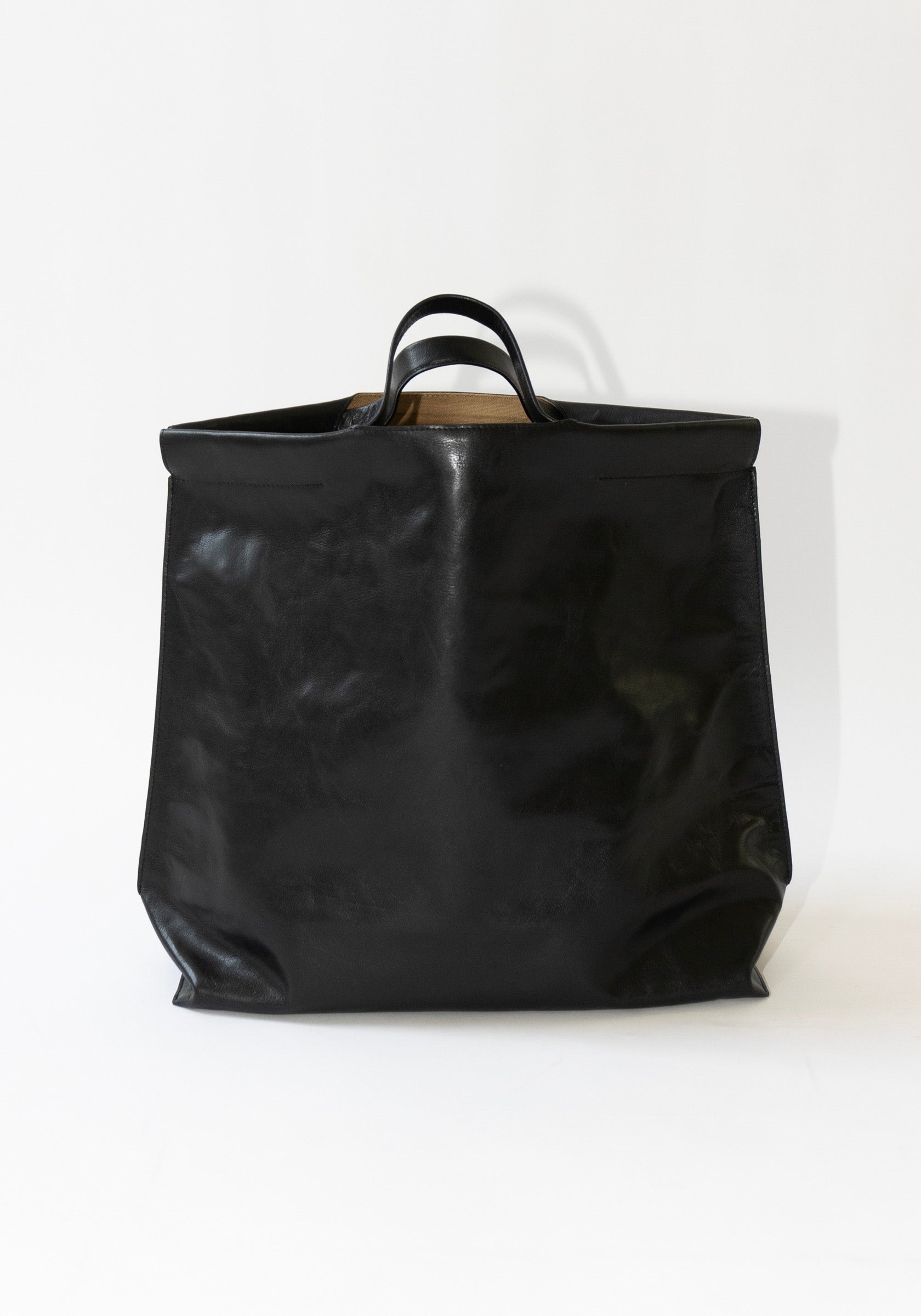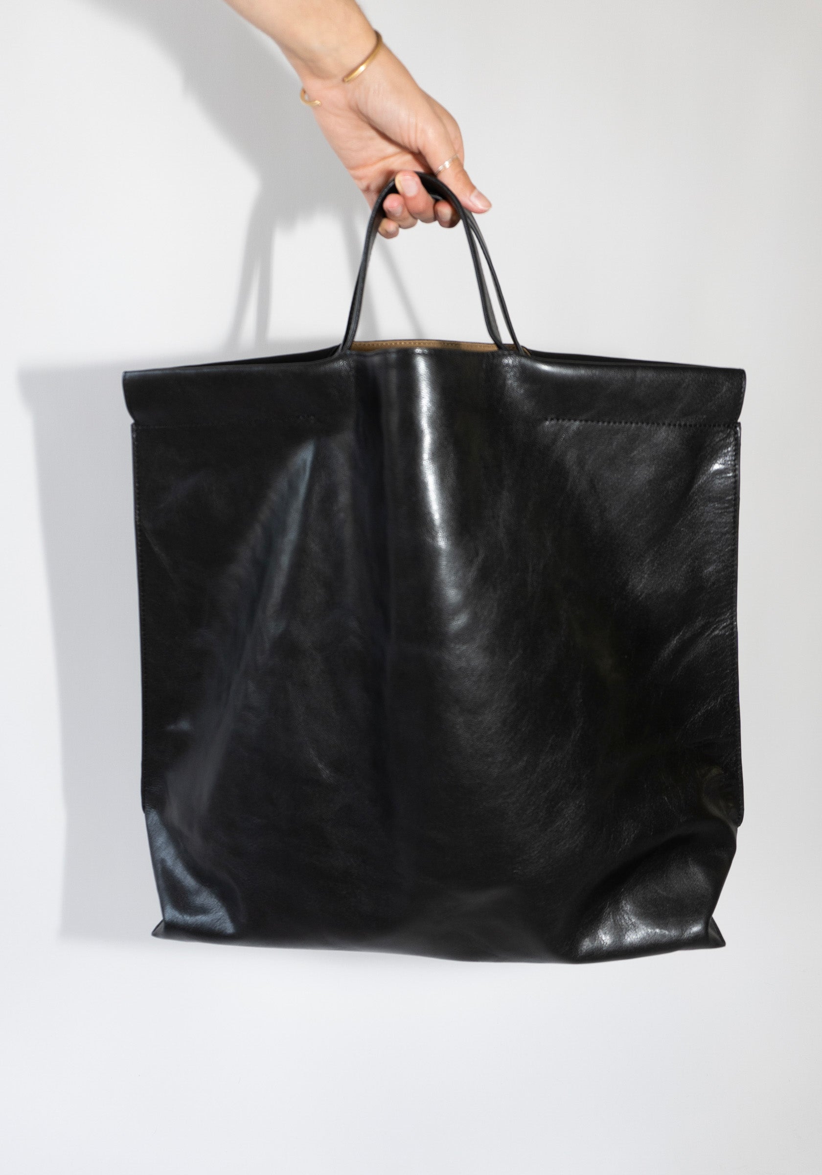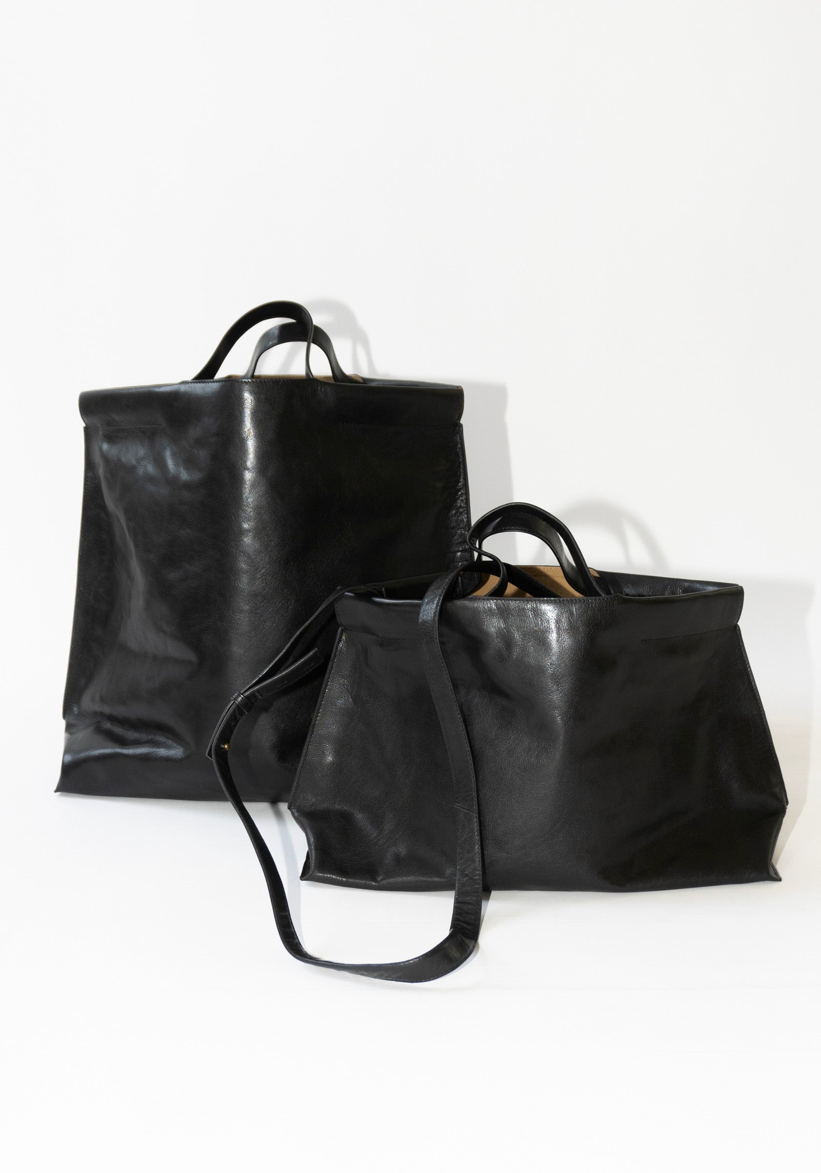 Large Shopper Bag in Black from Bea Mombaers. Tumbled leather bag with detachable interior pouch and short top handles in nappa leather. Features an interior zipper pocket, a detachable clasp key ring and two interior slip pockets. Top handles can convert into a single shoulder strap which creates a ruching effect. Lined in cotton canvas.