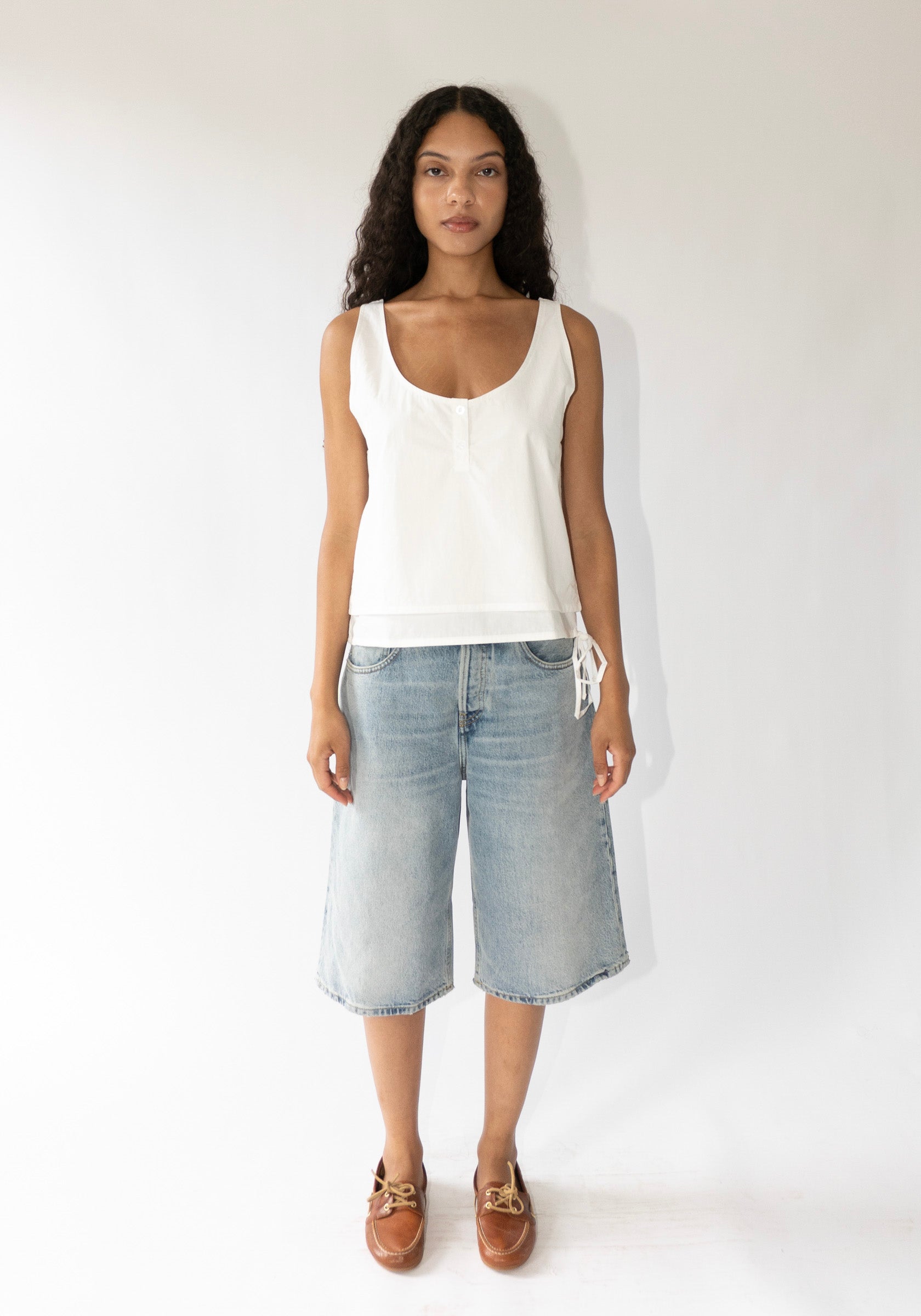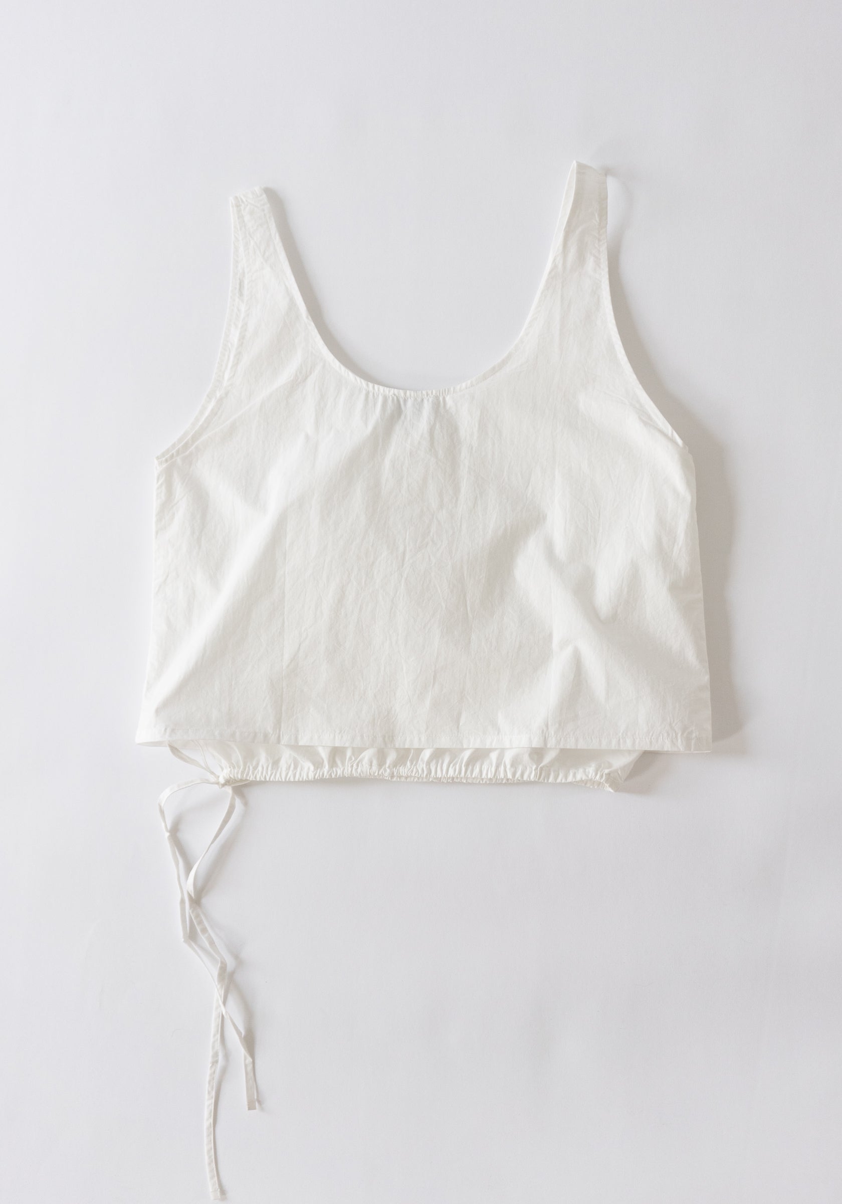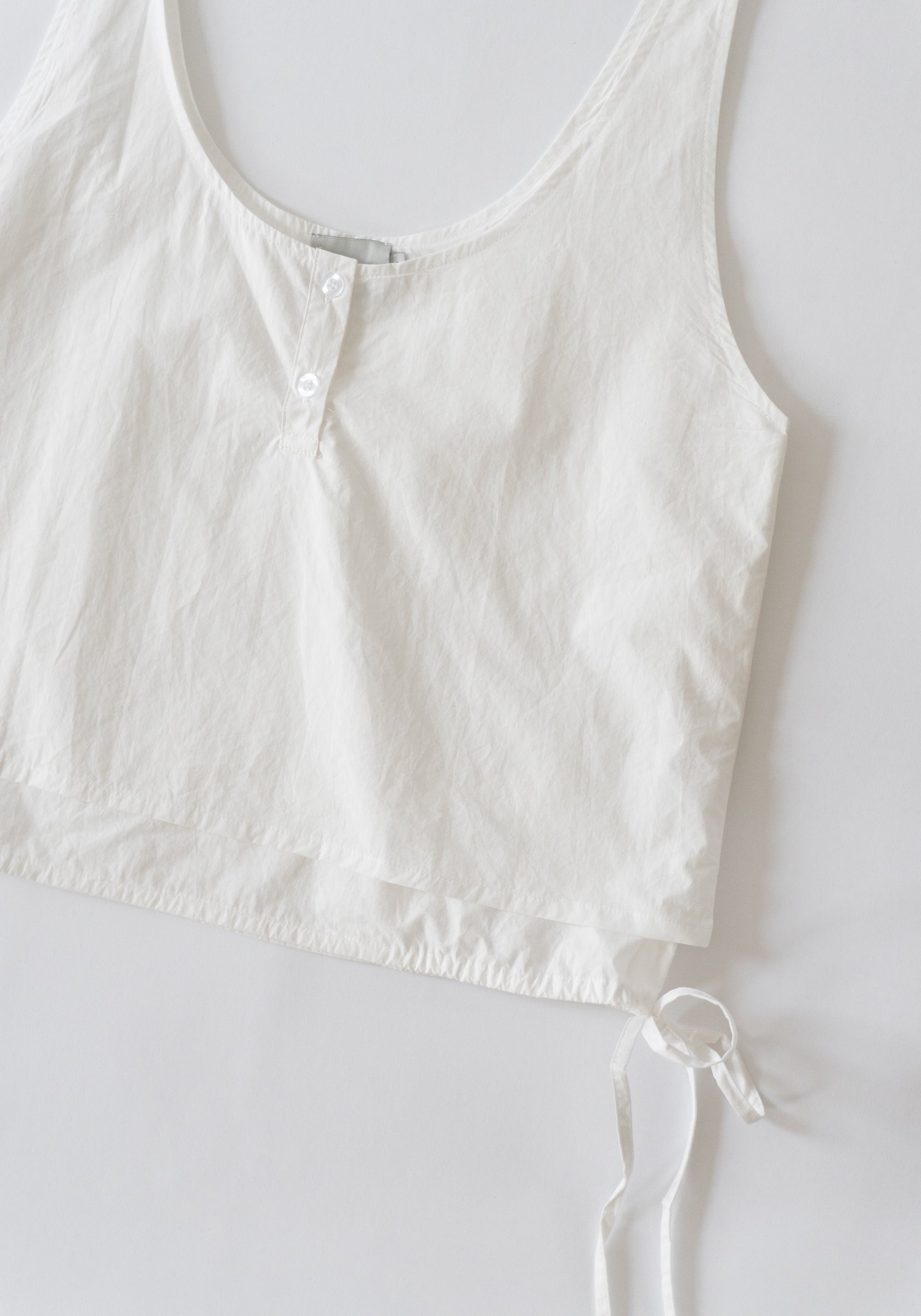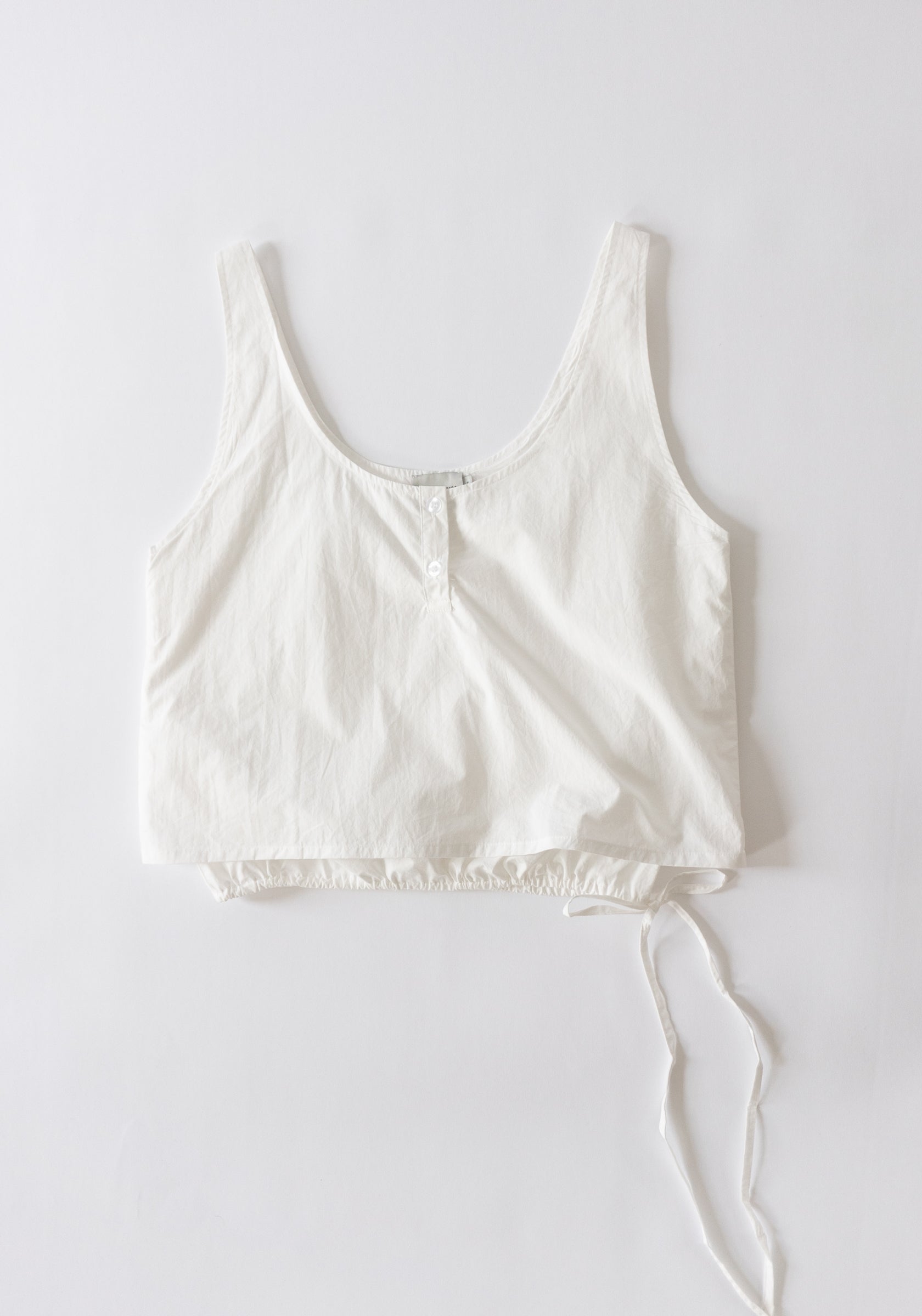 Layered Top in White from Deiji Studio. A double-layered sleeveless top featuring a soft scooped neckline and button front placket. Designed with a relaxed silhouette, drawcord hem and long waist ties for adjustable styling