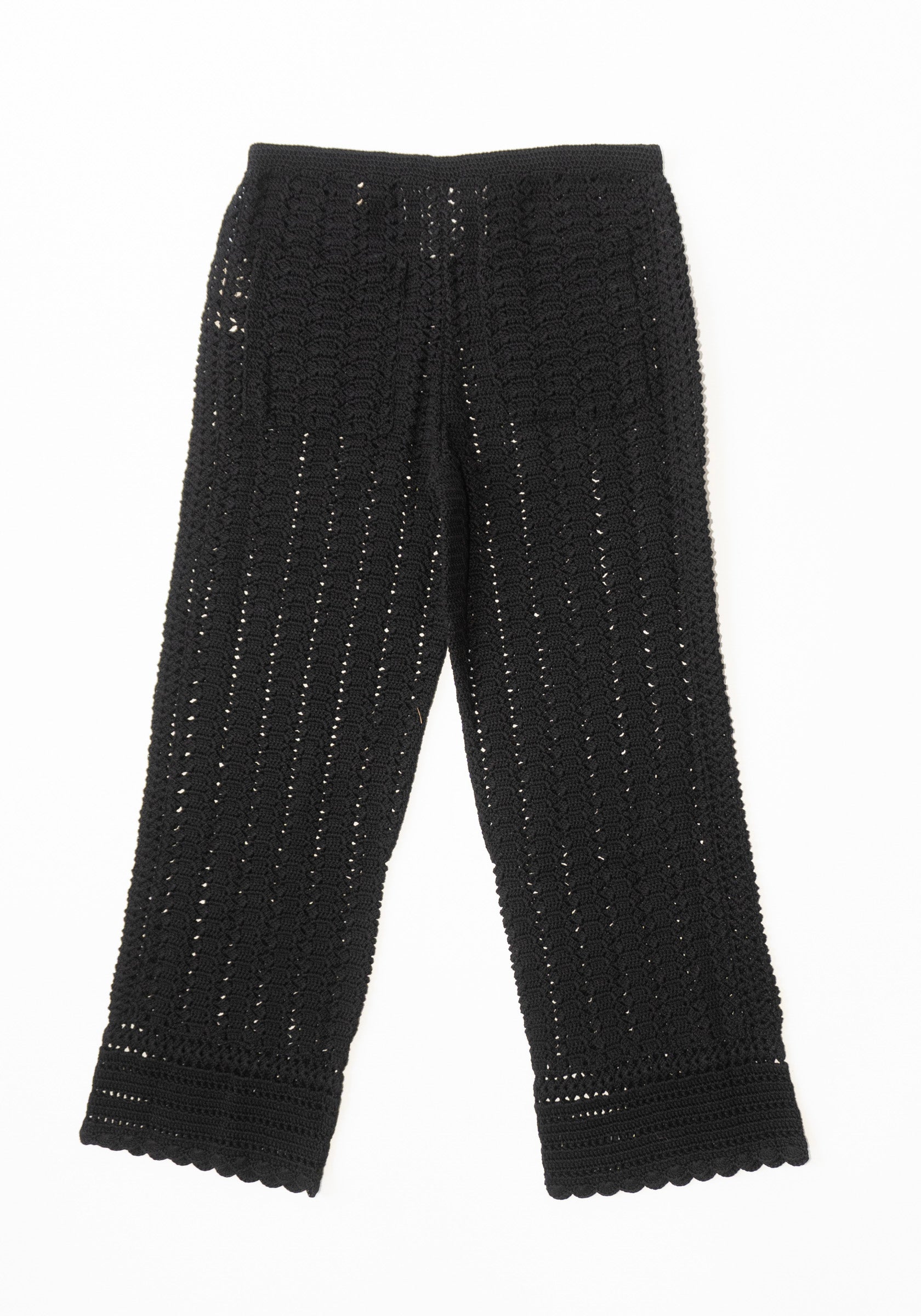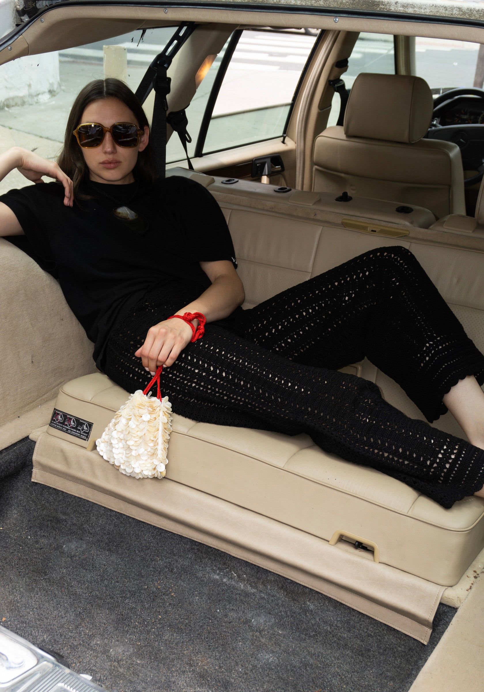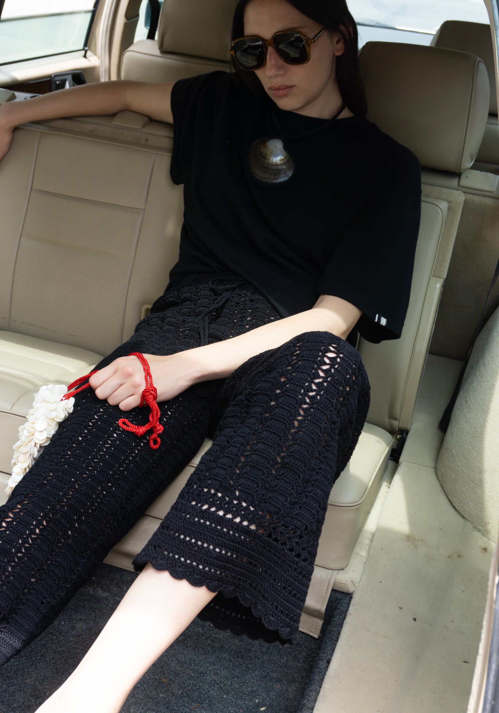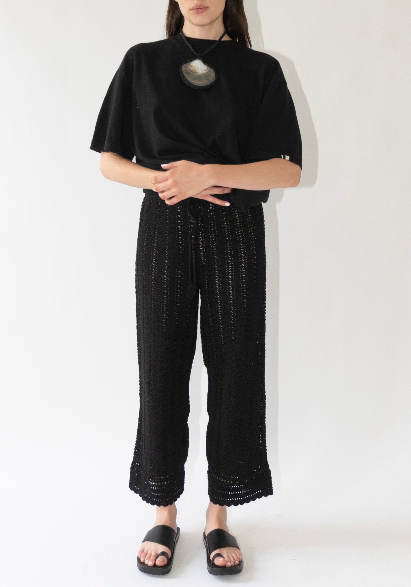 Carolina Pant in Black from Flor Studio. These pants are hand-crocheted with a low-rise, full length fit. Features and adjustable waist with a tie closure.