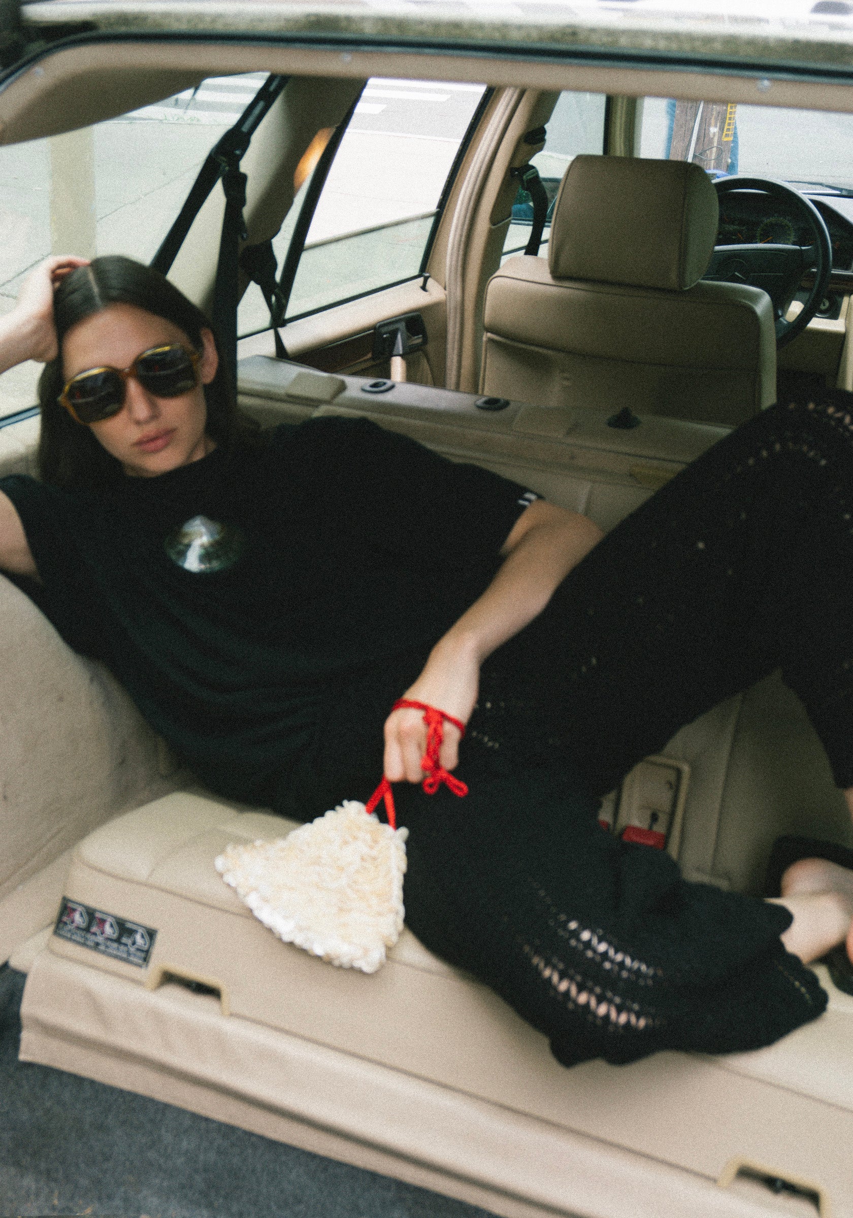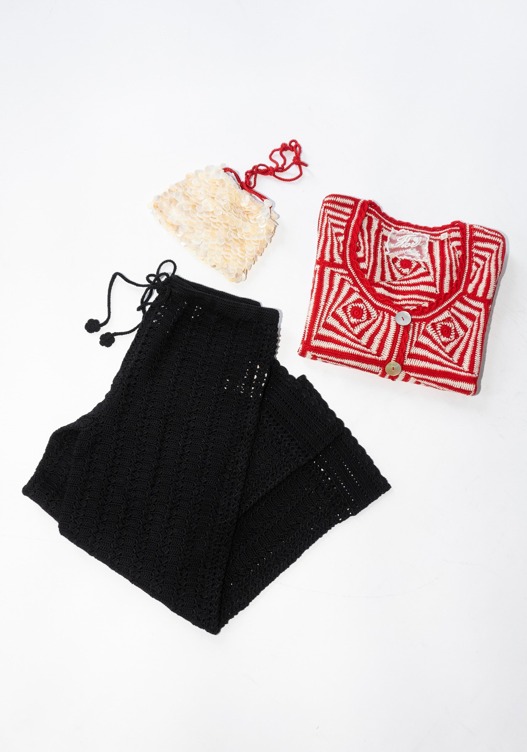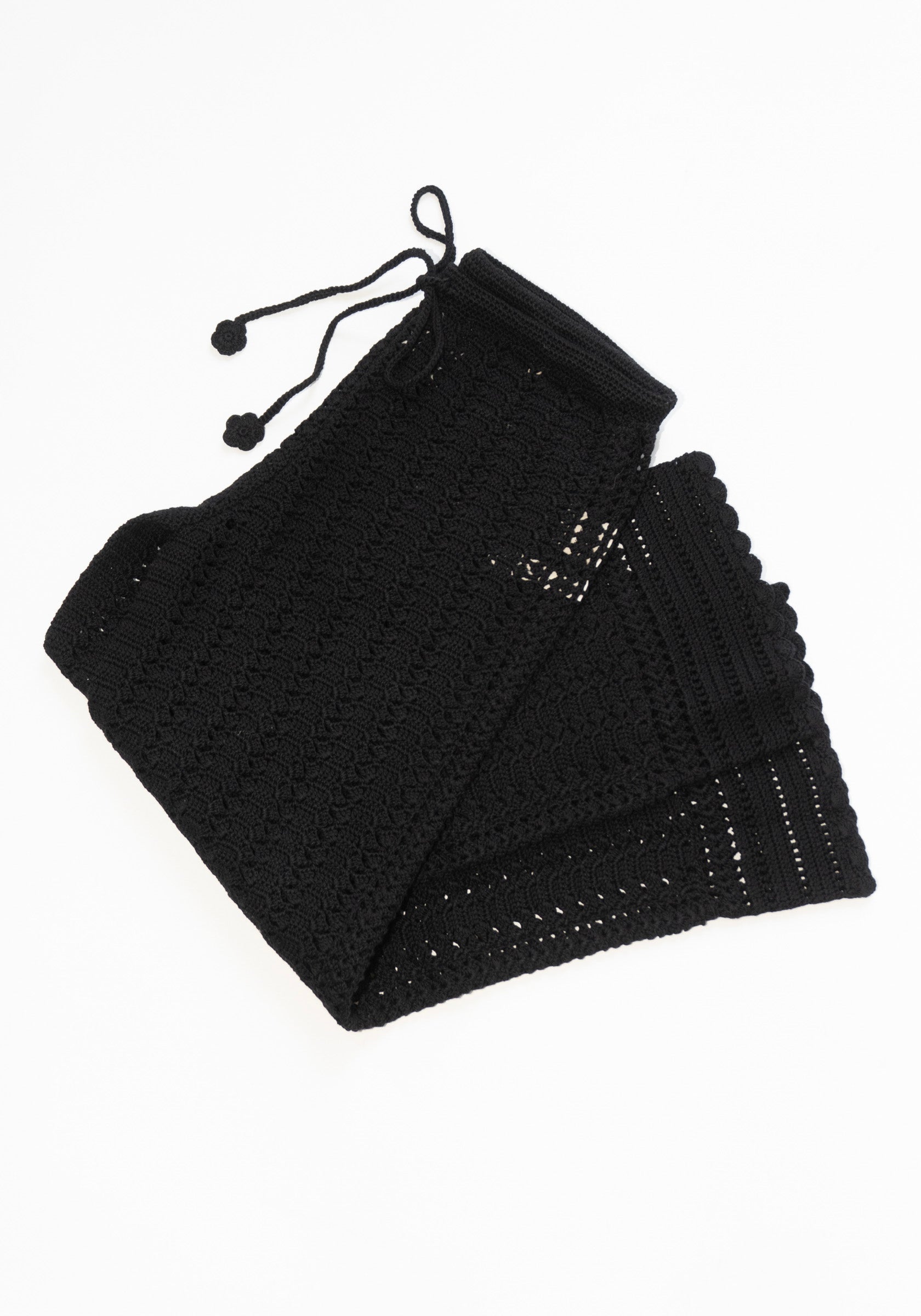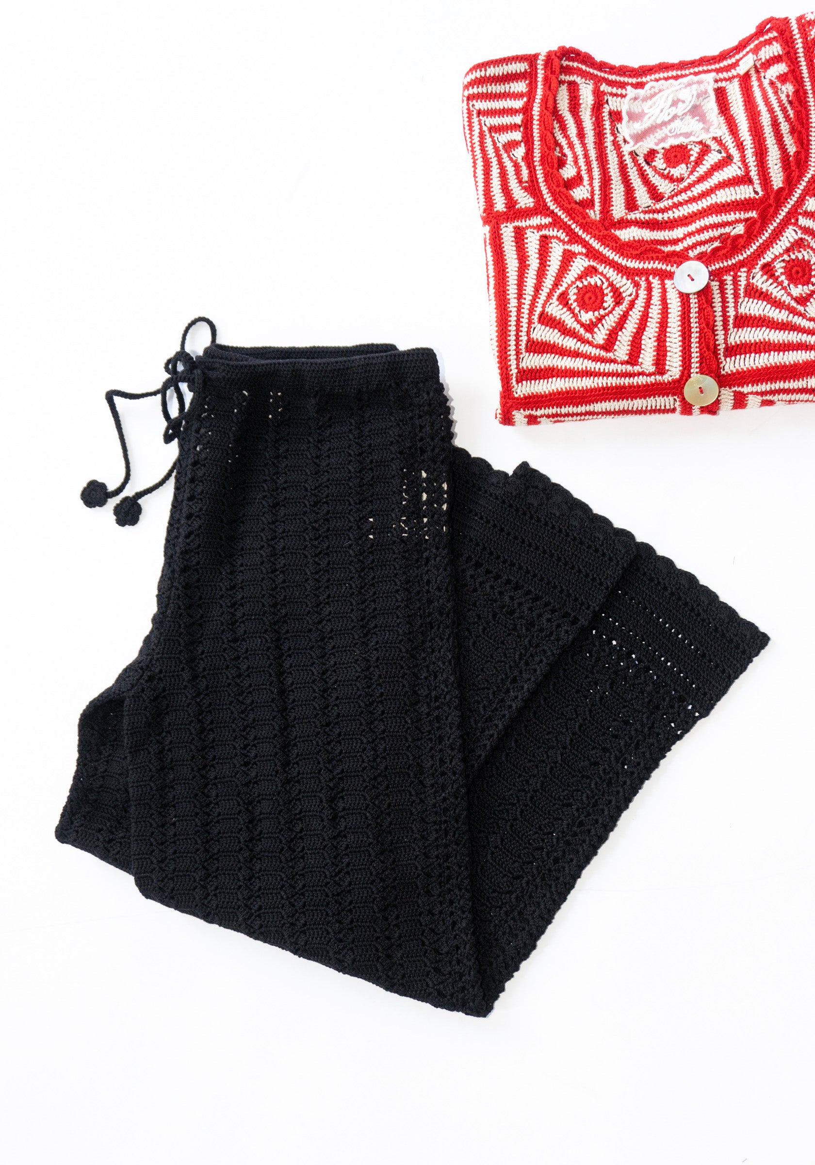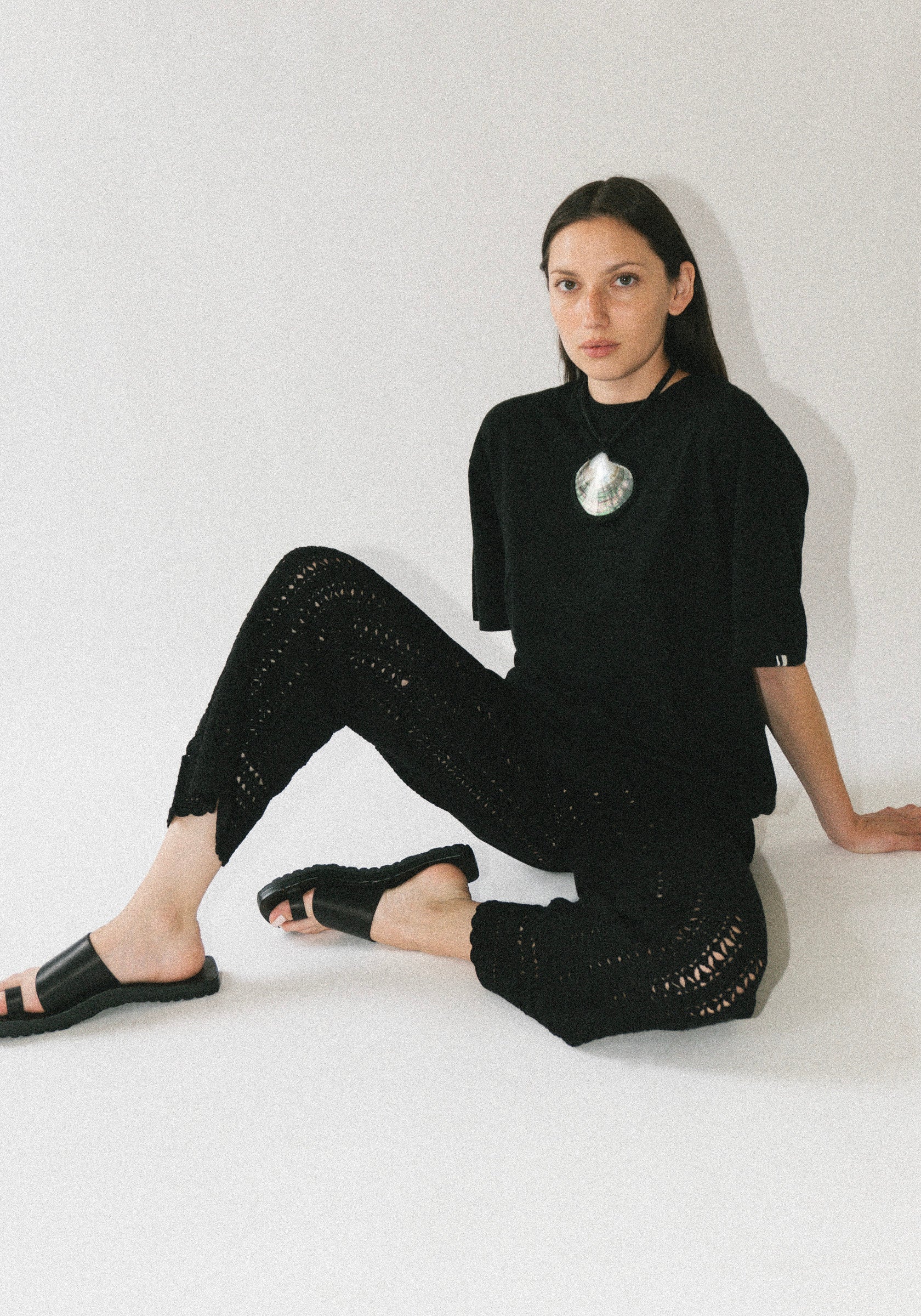 Carolina Pant in Black from Flor Studio. These pants are hand-crocheted with a low-rise, full length fit. Features and adjustable waist with a tie closure.