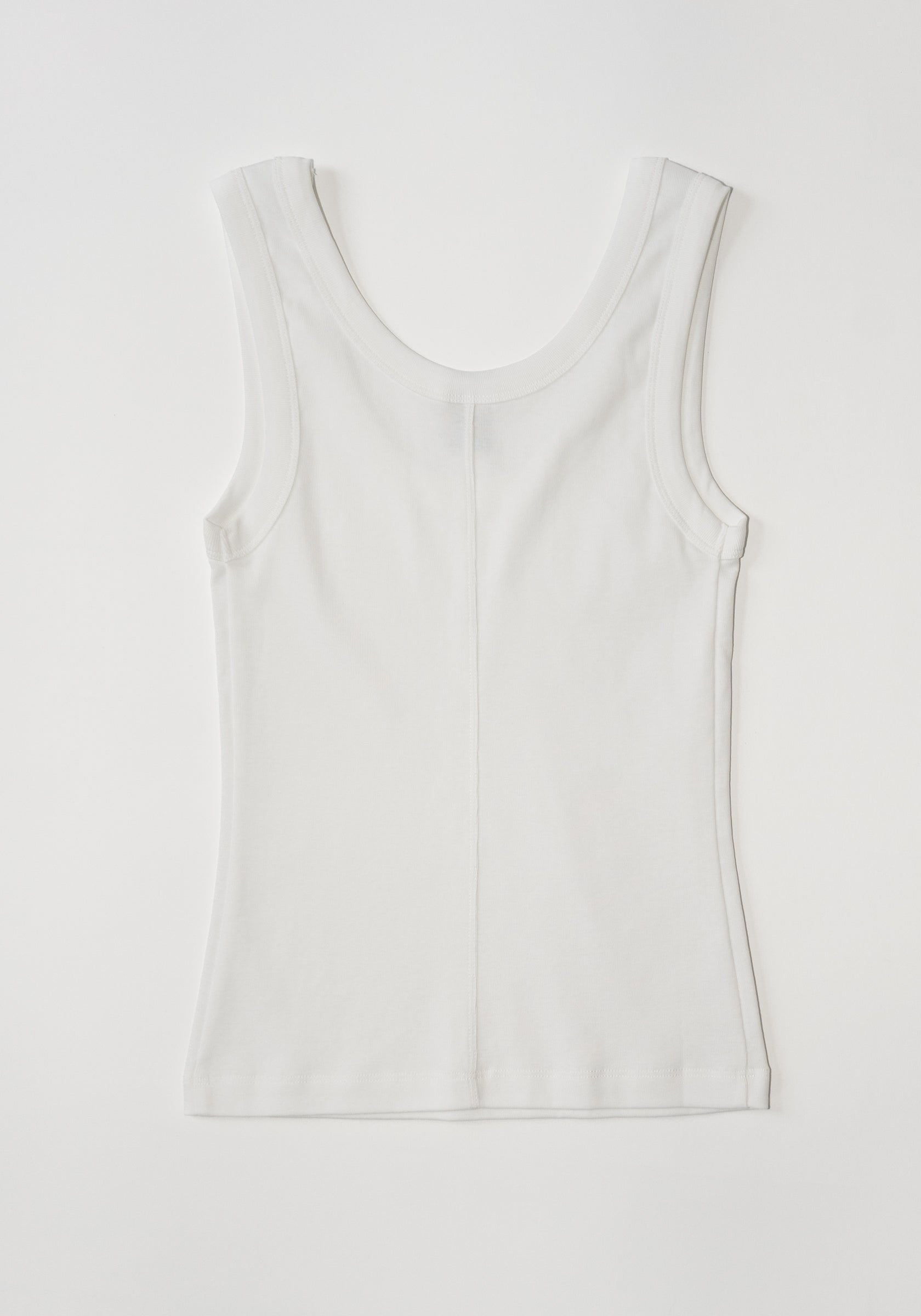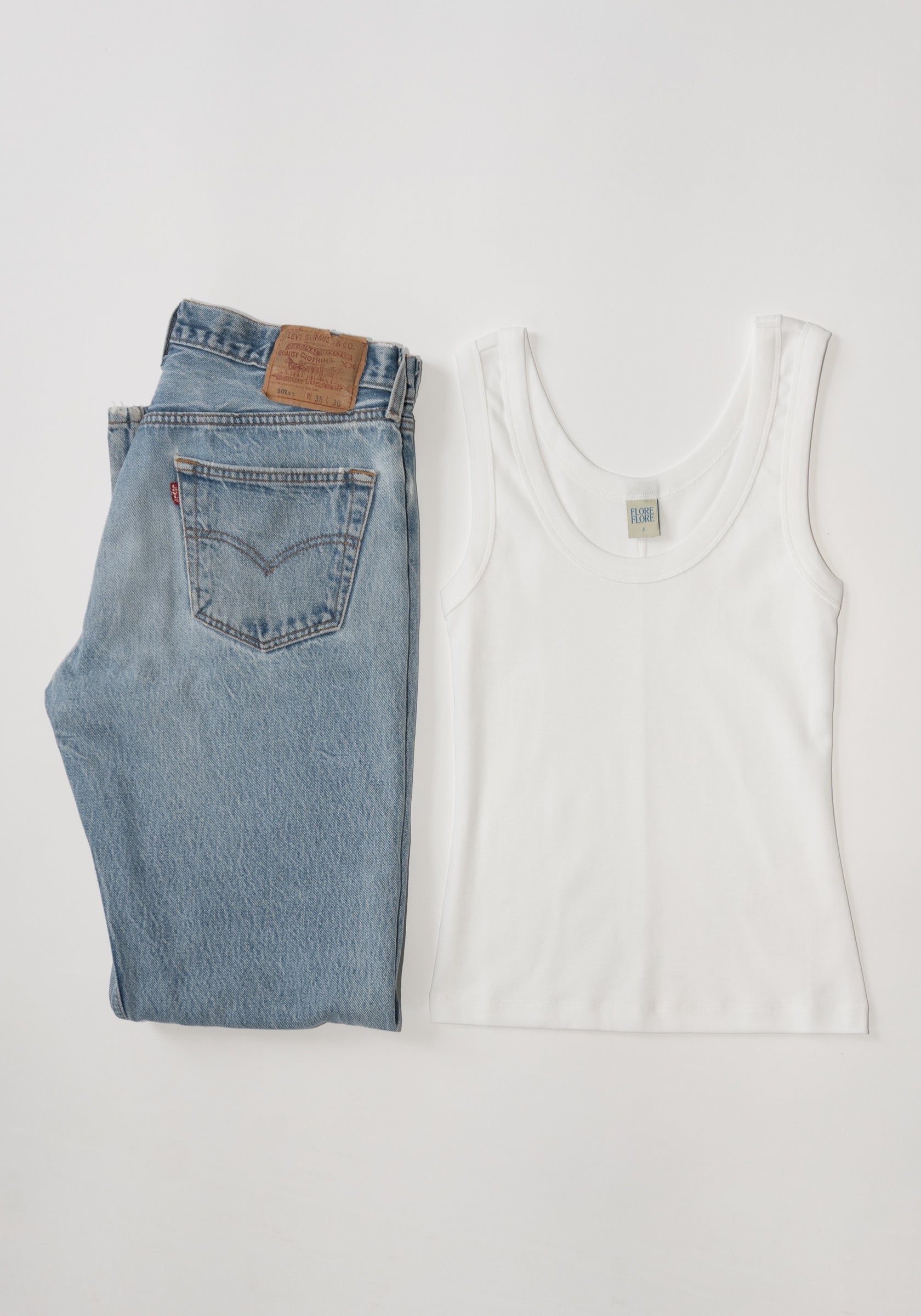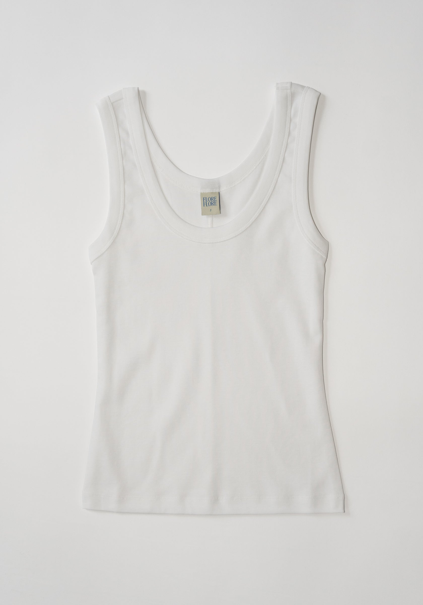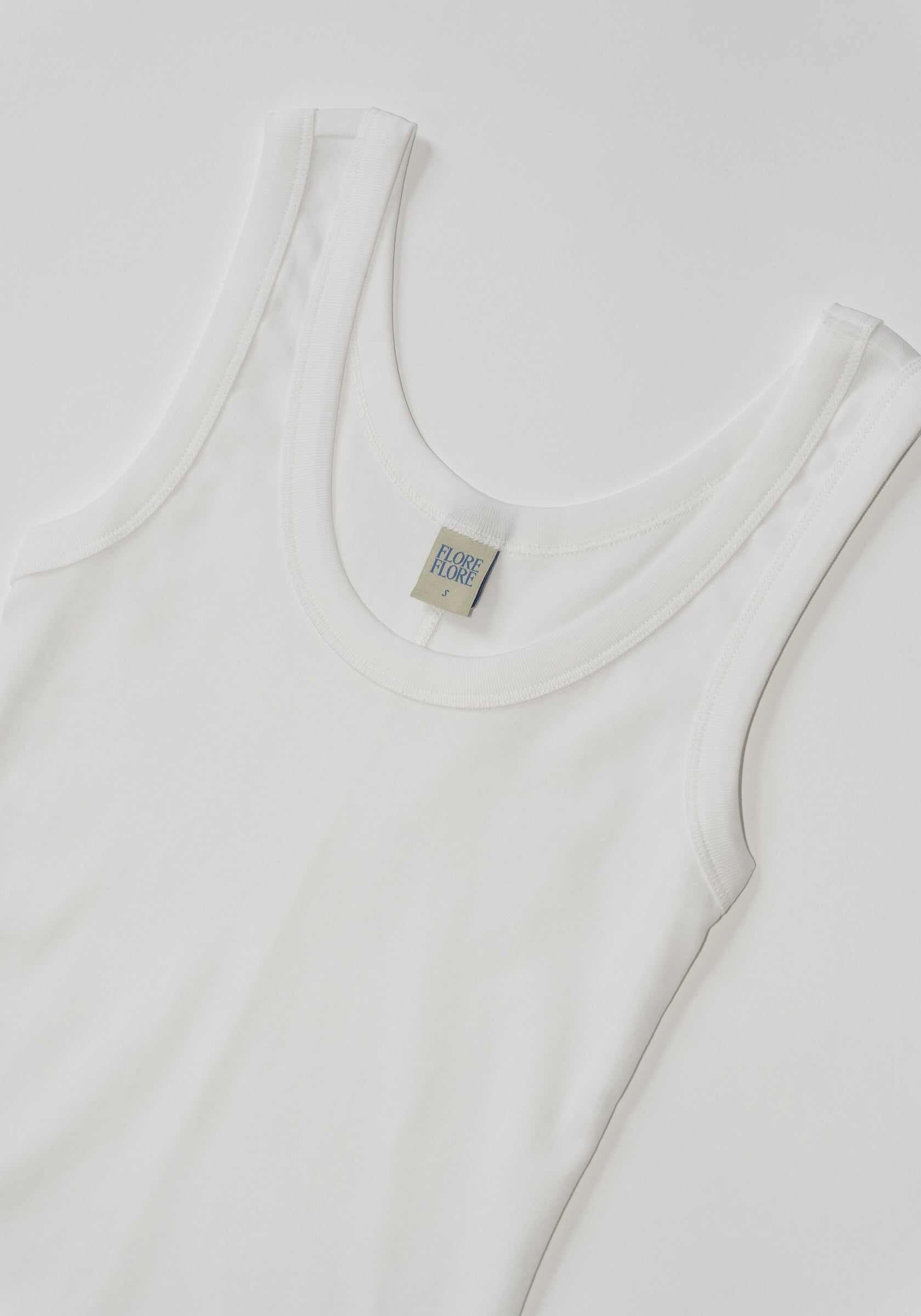 Hillie Tank in White from Flore Flore. Classic tank with a feminine scoop neck and back, made from medium-weight organic cotton rib.