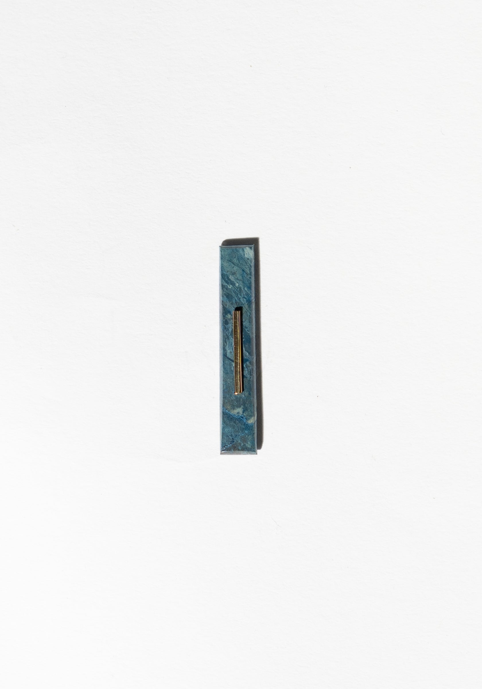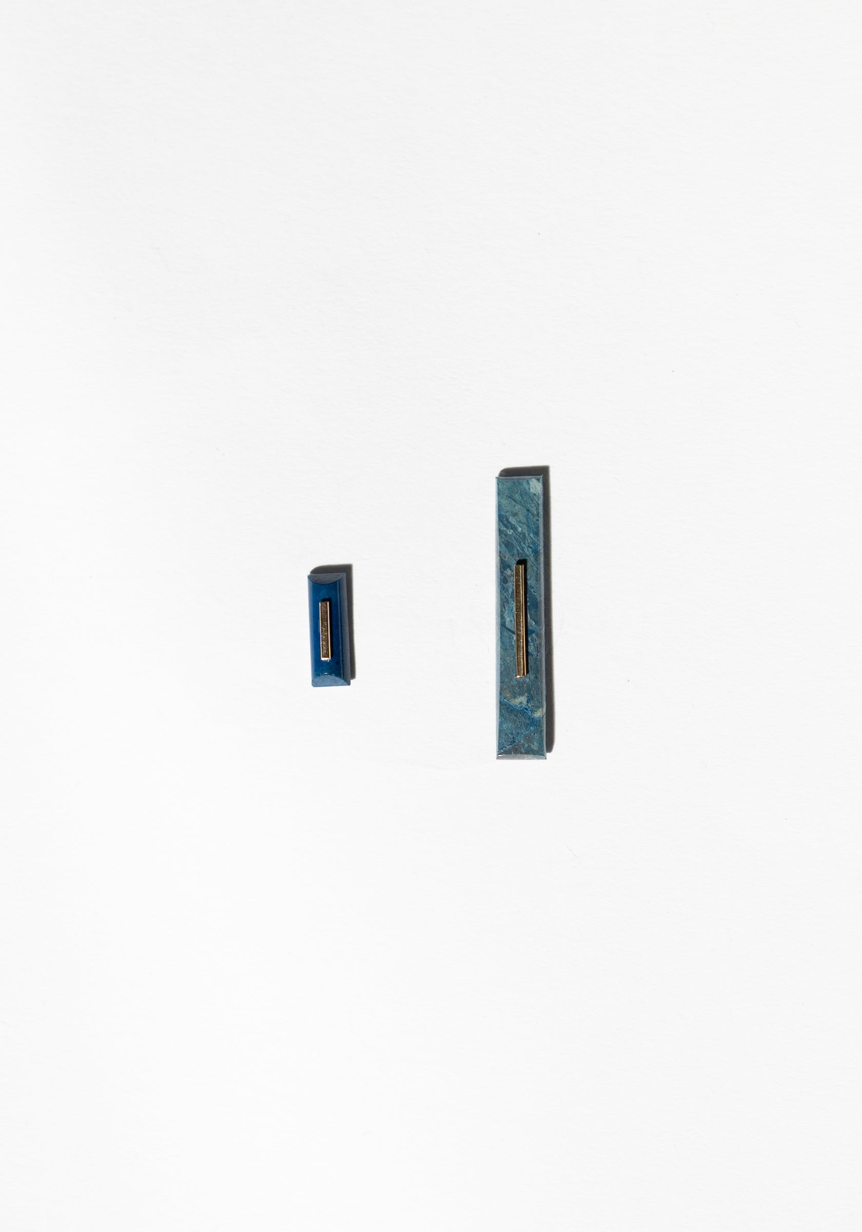 Long Lapis Stud Earring in gold from Kathleen Whitaker. Lapis stone in medium blue color mounted on 14 karat yellow gold staple stud and post. Stones are hand cut and each is one of a kind and may vary slightly in color. Sold as a single earring.